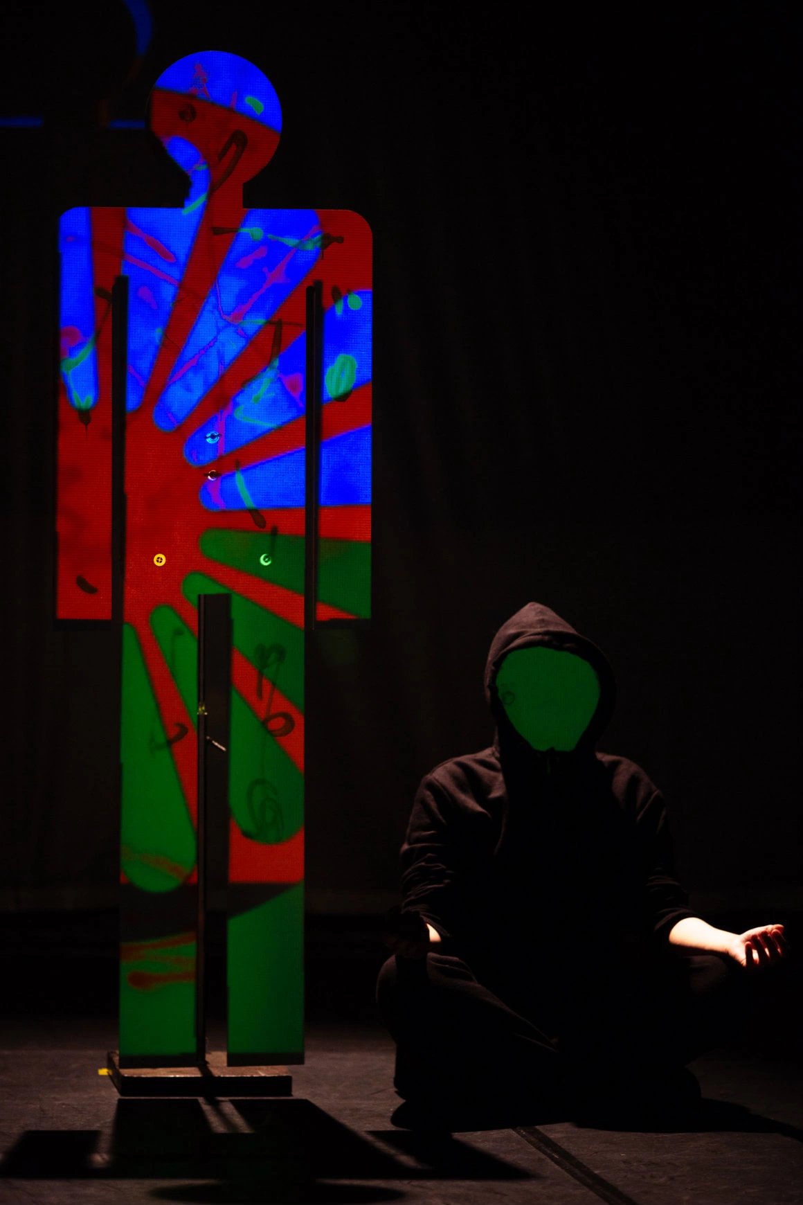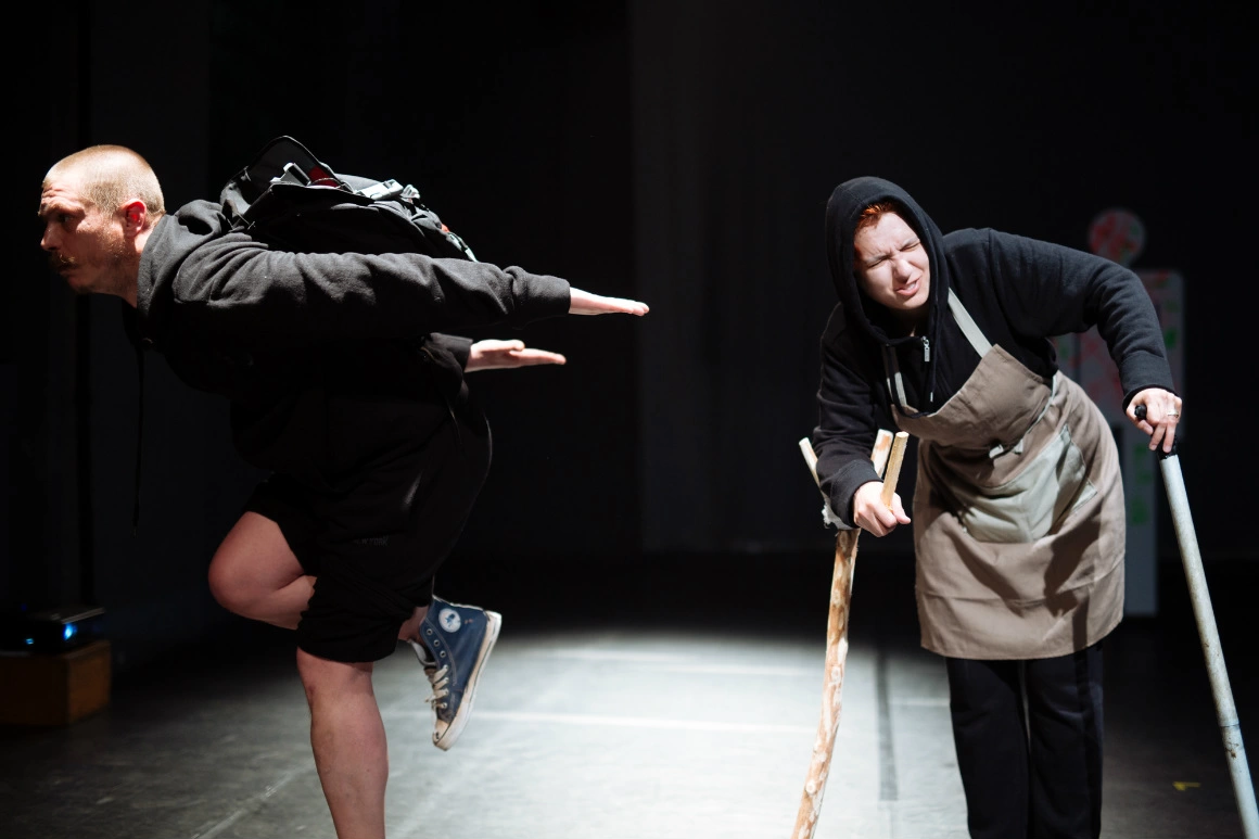 „Rom” înseamnă „om” în limba romani, sau „soț”, sau „bărbat”, așa cum și „român”/„rumân” însemna „om de rând” în Evul Mediu din spațiul României de astăzi. Asta afli în unul dintre momentele „punk” ale spectacolului Maskar – și n-ai cum să nu auzi, pentru că cei doi actori urlă în portavoci, aleargă pe toată întinderea spațiului de joc, desenează cu spray-uri pe siluete umane, cântă, fac rap, fac de toate ca să nu-i poți ignora.