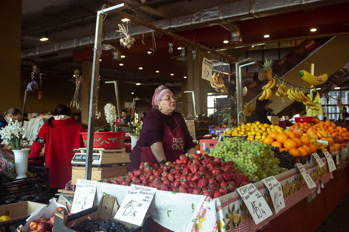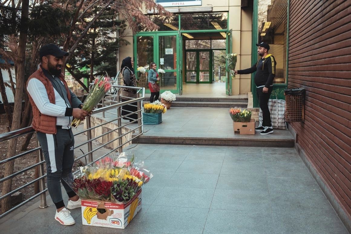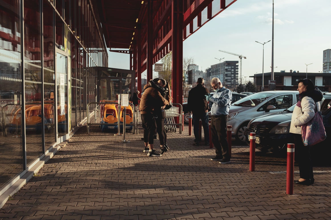 Cumpăr căpșuni, usturoi și lalele de la o doamnă. Are mănuși negre de plastic și, spre deosebire de casierii epuizați de la Mega (mulți fără mănuși), nu pare apăsată de frenezia cumpărăturilor. „Ce să facem domnișoară, suntem la muncă. Mi-e frică, cum să nu-mi fie. Dar eu am avut o viață frumoasă, mi-e milă de nepot, că nu înțelege de ce trebuie să stea în casă când e soarele ăsta afară. (...) Am văzut la televizor, se îngrămădesc toți la supermarket, când aici avem de toate. Fructe, legume proaspete, sănătate curată.”