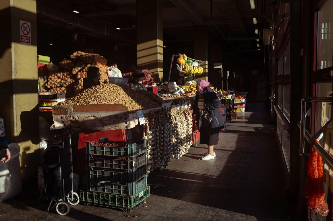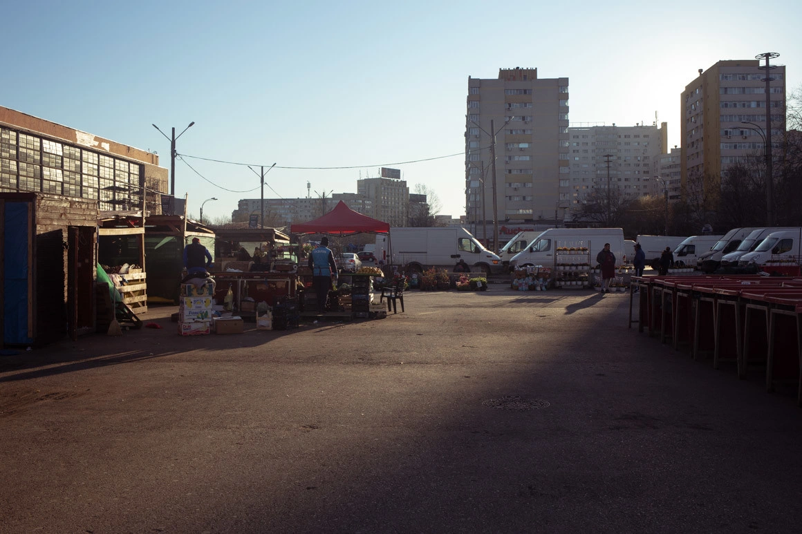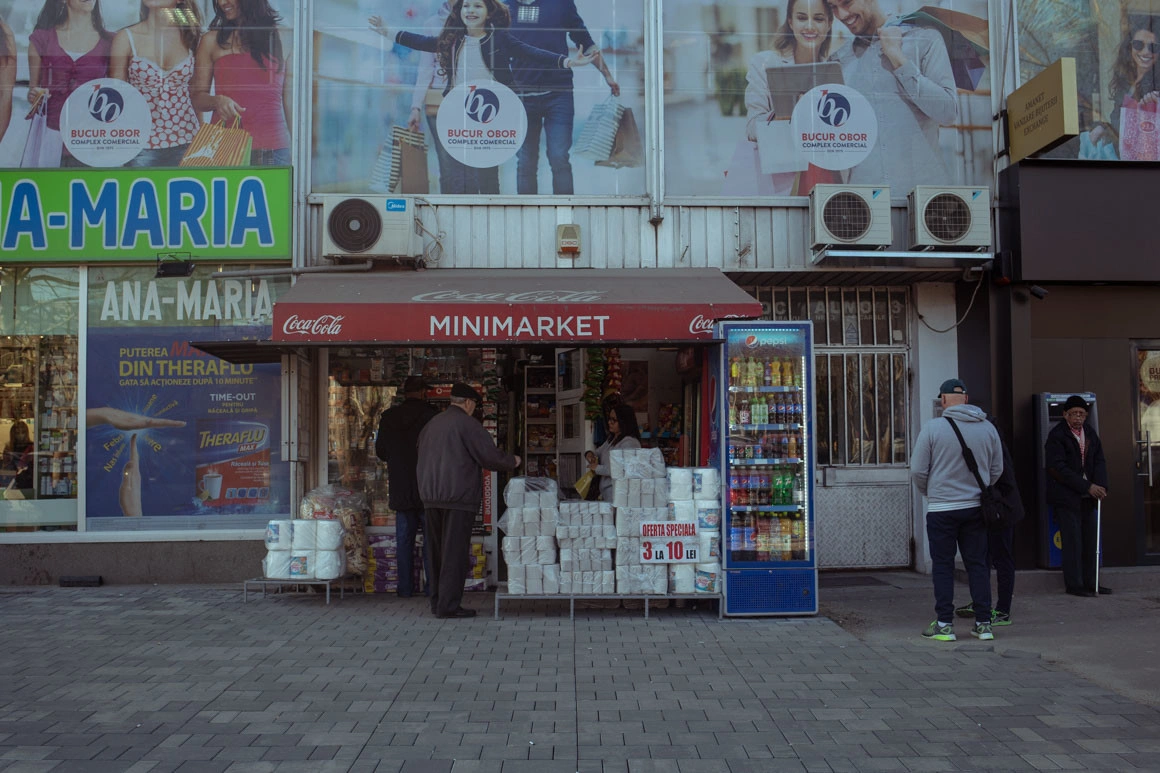 Mă așteptam să găsesc pe stradă aceeași atmosferă de duminică. Dar lumea în continuare trebuie să meargă la muncă, așa că la metrou, prin cartiere și pe bulevardele mari e plin de oameni. La Obor sunt mormane de fructe, legume, nuci și usturoi, flori. Cum intri în piață, te întâmpină câteva dealuri de suluri albe: pentru nevoia mare de hârtie igienică au apărut mai multe oferte - 3 la 10 lei sau 5 la 10 lei. În parcul de lângă primărie, bătrâneii joacă șah și table. Din trotuarul de lângă magazinul Obor ies cabluri și fiare. Printre ele, pe gardul de piatră, oamenii stau la o țigară, un băiat mănâncă semințe. Mă uit hipnotizată la el cum își atinge buzele de zeci de ori și scuipă pe jos cojile care lucesc în soarele călduț.