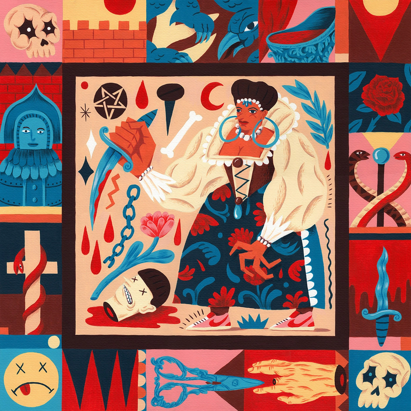 Dar există și destul de multe femei criminale în serie și, din câte am înțeles, Bathory este cea care a avut cele mai multe victime. În plus, eram într-o perioadă de Game of Thrones și mi s-a părut o schimbare mișto — de la o estetică mai contemporană, urbană, să merg într-o zonă cu elemente medievale, instrumente de tortură, cranii etc. Mi s-a părut tare că într-o istorie dominată de bărbați, regi, conducători militari, super violenți și cruzi, Elisabeta Bathory iese în evidență cumva prin setea ei de sânge și prin faptul că e femeie, deși aparent omora tot femei. În ilustrația mea, care nu e și nici nu încearcă să fie foarte precisă istoric, am facut-o tăiând un cap de bărbat pentru că așa avea mai mult sens.