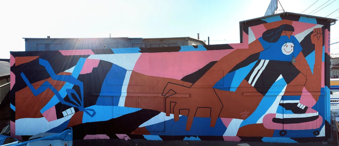Îmi ajustez muralele uneori în funcție de temă, dacă există, sau în funcție de elemente din cultura locală care mi se par atrăgătoare sau care au oarecare legătură cu gusturile și subiectele mele. Spre exemplu, în Viena, festivalul la care am participat avea o tema generală, și anume cifra 5. Mă inspir sau iau chestii din ce am la îndemână. Atunci citeam A șasea extincție, de Elizabeth Kolbert, și am ilustrat cele cinci mari extincții din istoria Pământului. În Rabat, am încercat să iau elemente vizuale, din cultura locală, forme pe care le-am văzut pictate pe uși de garaje, pattern-uri de pe genți fake Louis Vuitton. În Seattle, tema era mișcarea, iar forma clădirii pe care am pictat m-a inspirat să pictez o femeie skater. Tocmai atunci începusem să lucrez la seria cu Strong Women și una din piese era cu o femeie din India care se dă cu placa. Deci, nu știu, aș vrea să zic că e aleatoriu, dar nu e, e oarecum un combo între chestii locale și influențele și preocupările mele din momentul respectiv.