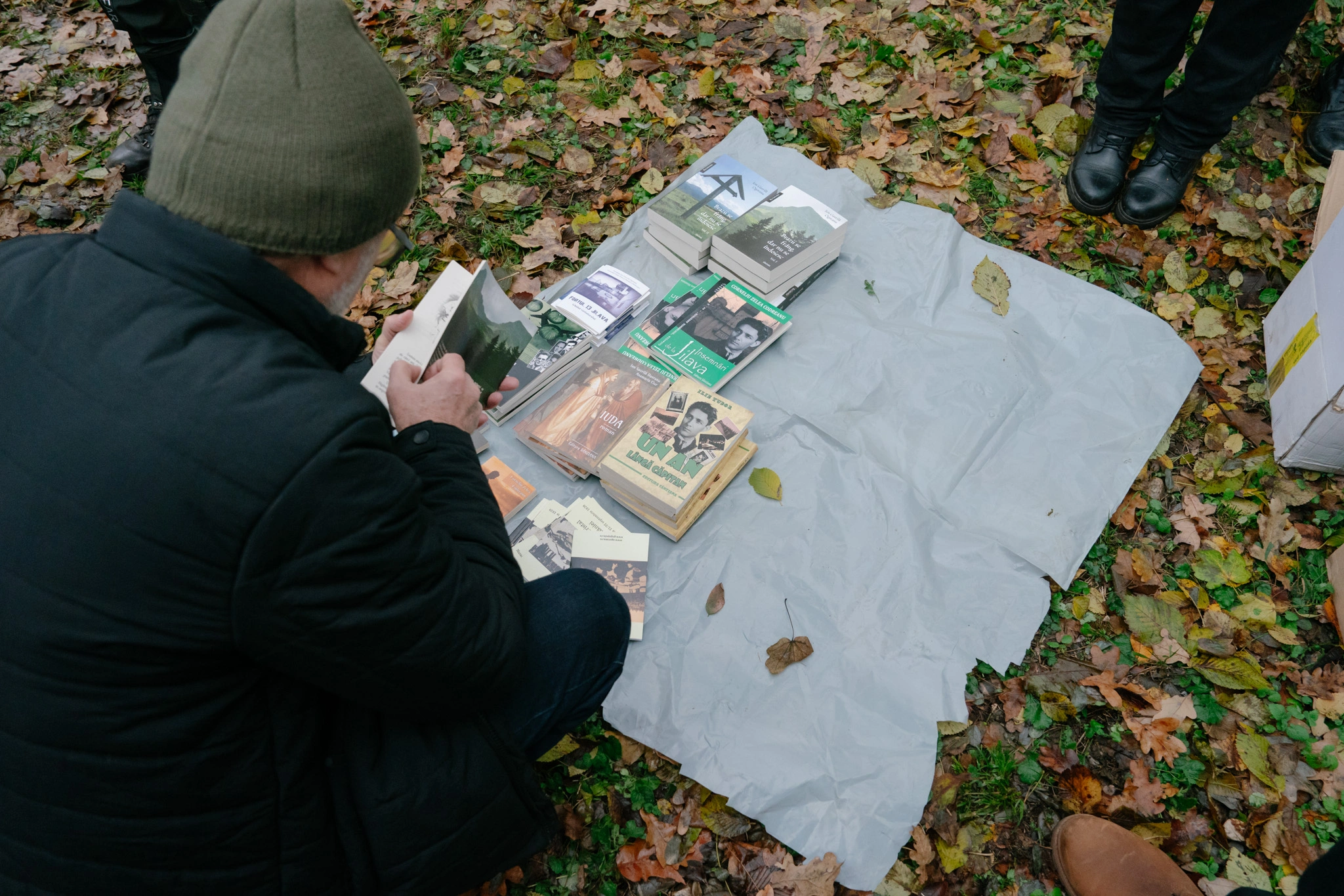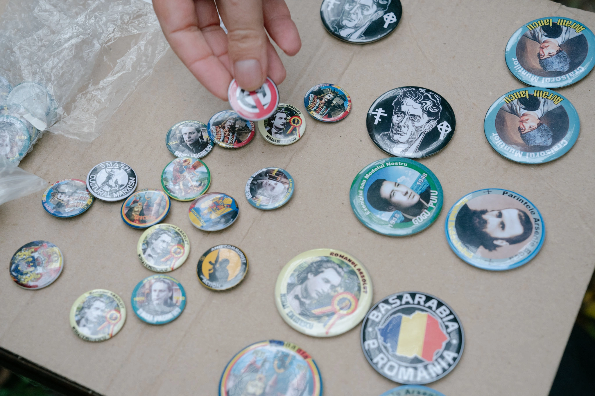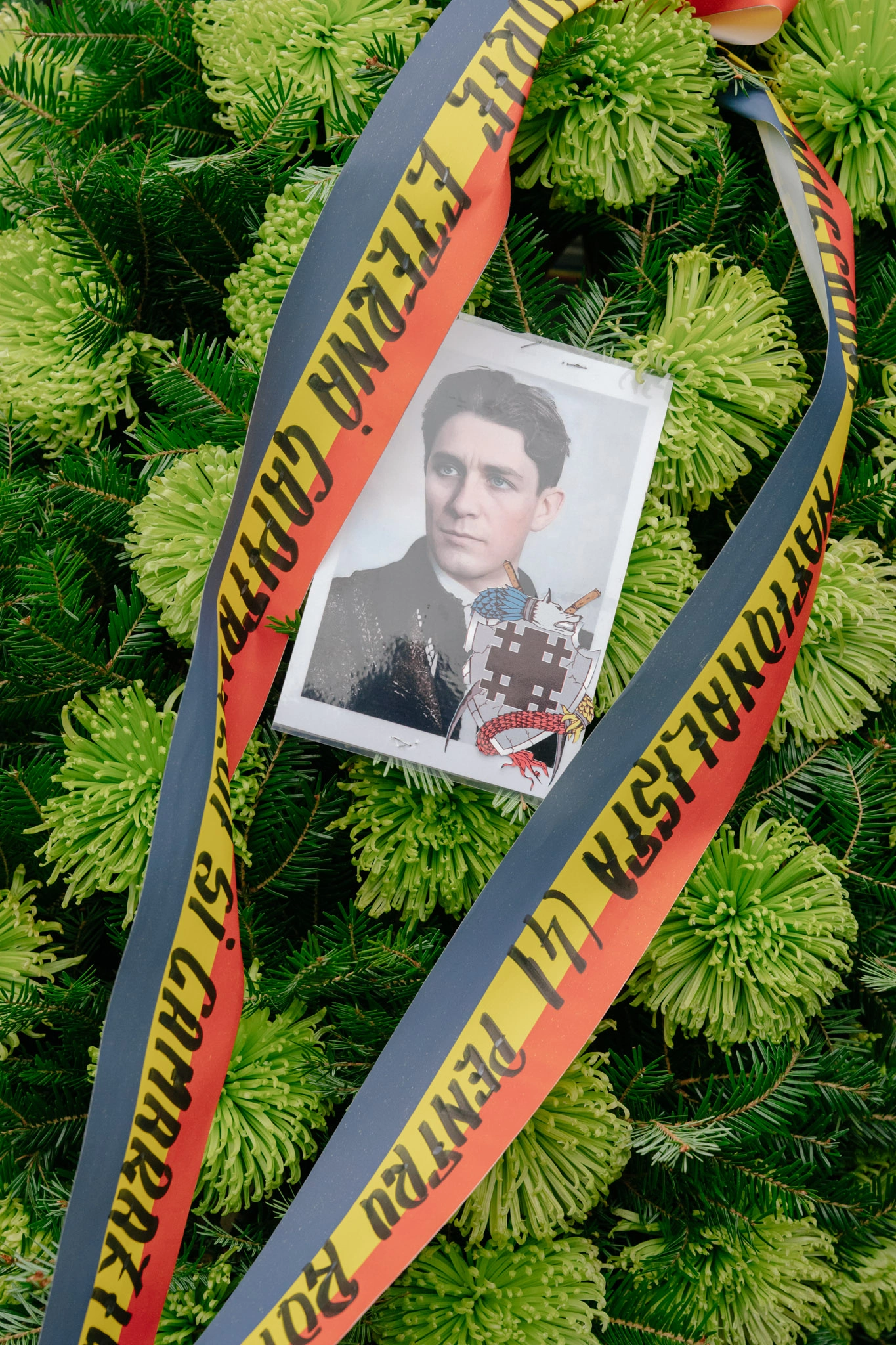 Lângă troiță, alți bărbați întind o masă cu cărți despre Codreanu și Mișcarea Legionară și insigne cu Garda de Fier și Arhanghelul Mihail, două dintre numele pe care le foloseau legionarii pentru organizația lor, în perioada interbelică. „Vreau să-mi iau o insignă, dar n-am bani”, îi spune un puști prietenului său. Potrivit ordonanței 31 din 2002, e interzis să vinzi sau să afișezi insigne cu însemne legionare în spațiul public.