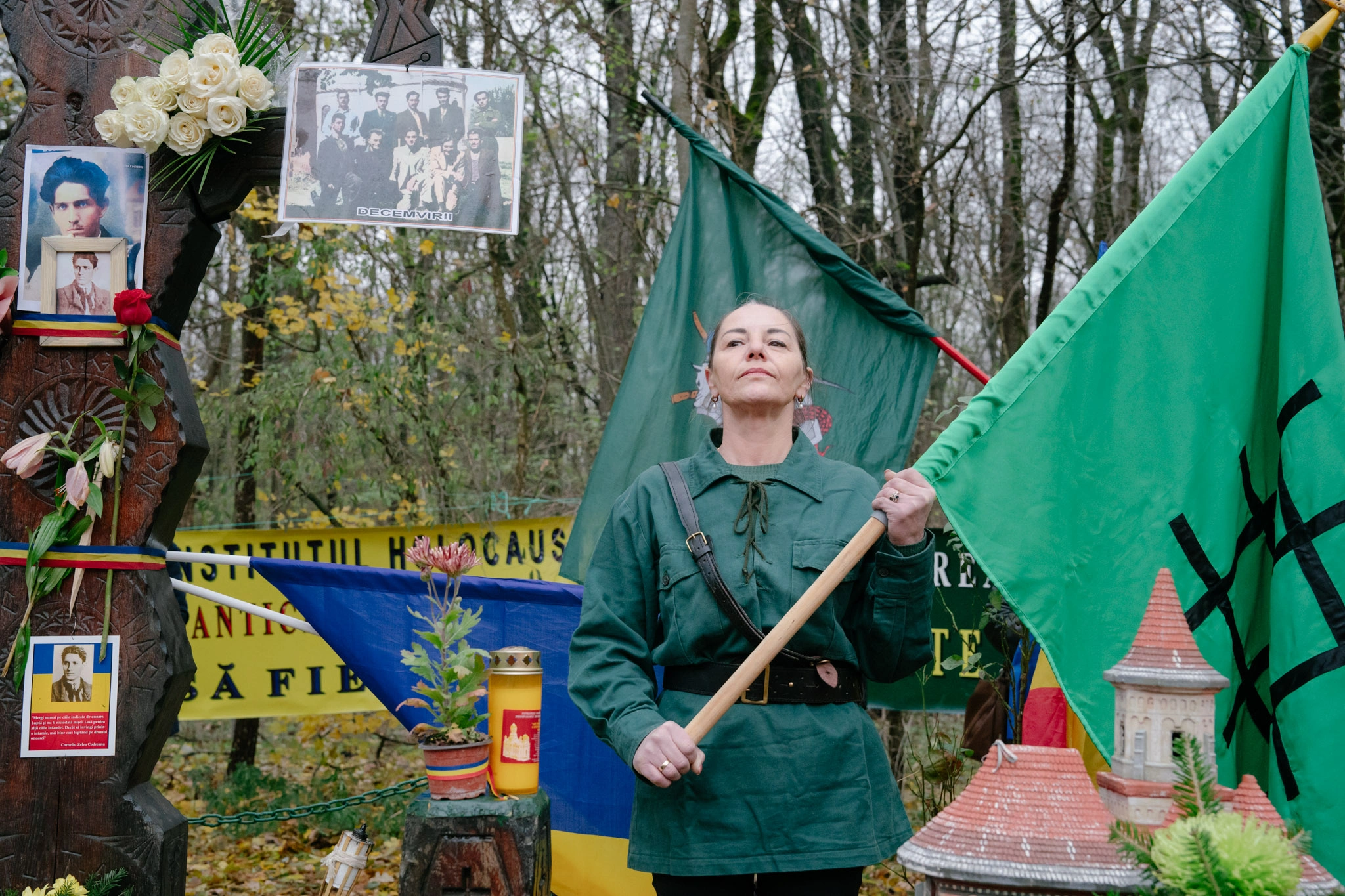 Lumea se strânge în fața troiței, în jurul unei mese pe care se află colivă, pachete cu pomană și sticle de vin. Preotul începe slujba în foșnetul steagurilor tricolore, alături de simboluri care astăzi sunt interzise de lege. Un bărbat în jur de 50 de ani strânge la piept o carte cu figura liderului legionar.
