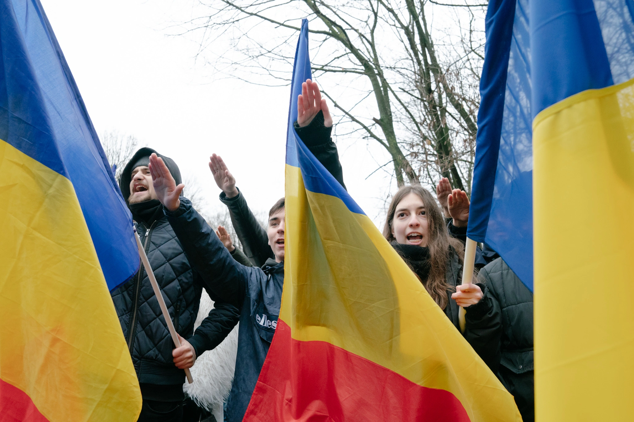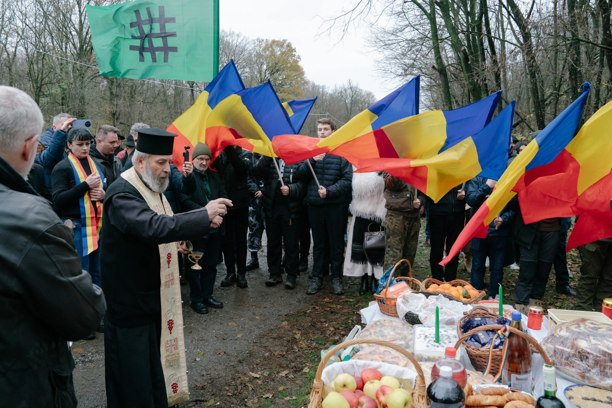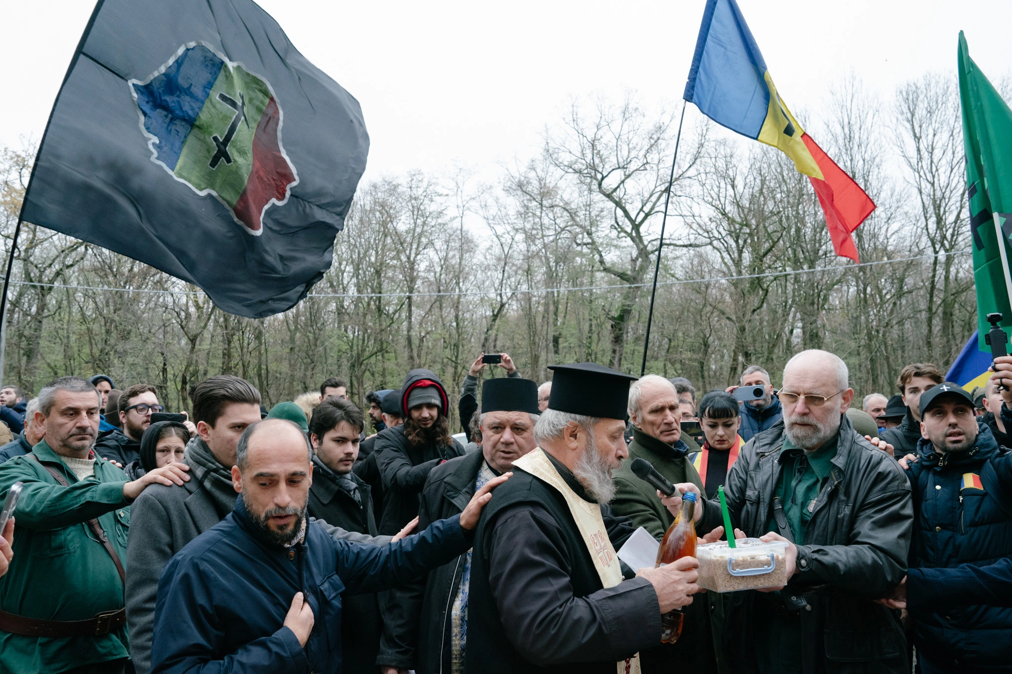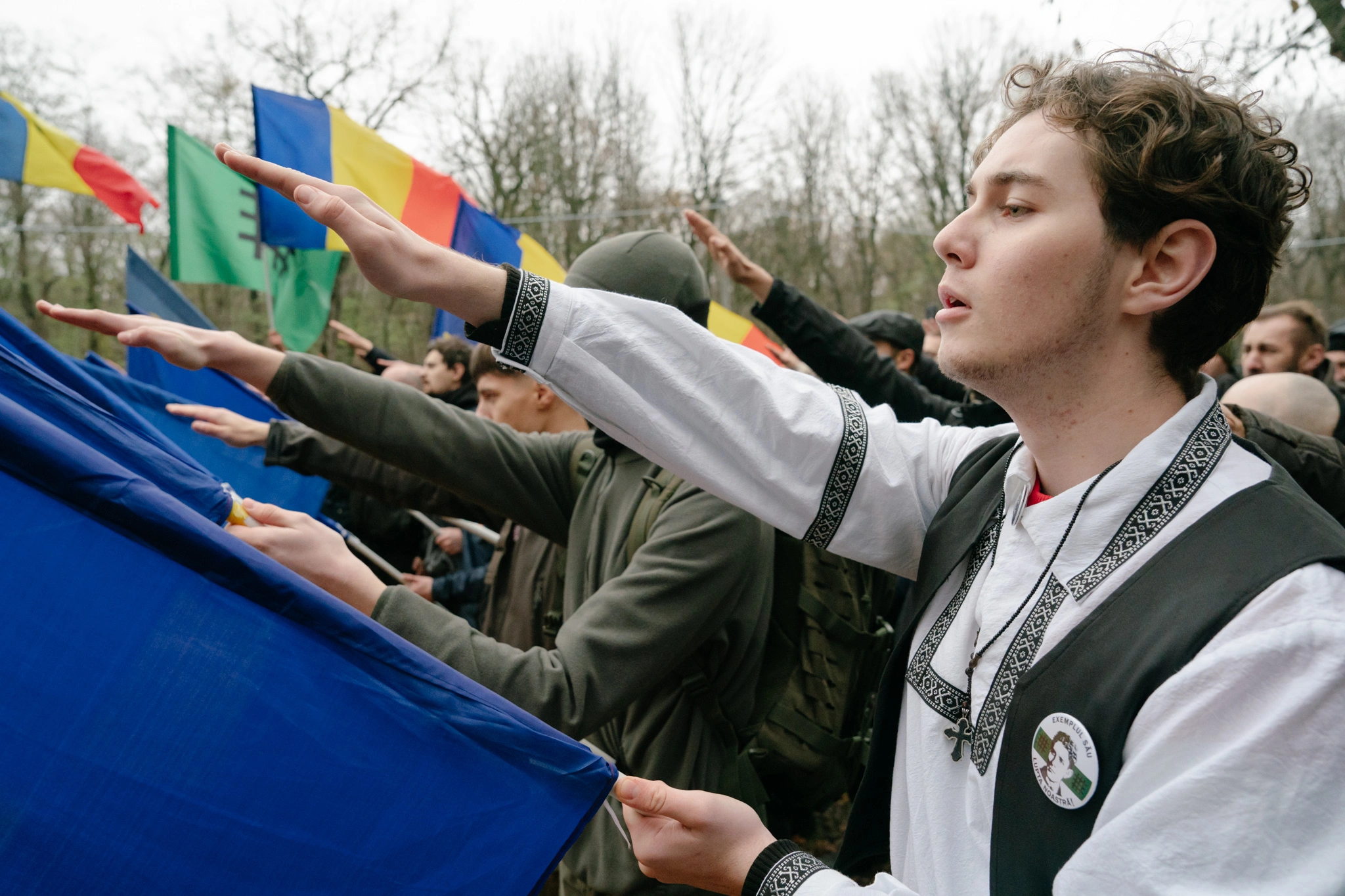 Doi băieți până-n 20 de ani chicotesc când aud că a venit presa. „Au venit legionarii, tineretul ăsta pierdut! De ce nu votați bărbat cu bărbat?!”, își imaginează unul dintre ei că vor spune jurnaliștii. E îmbrăcat în palton de piele neagră și figura lui mi-e familiară de la o altă comemorare legionară la care am participat, unde purta un tricou al organizației ultranaționaliste „Comunitatea Identitară”. Această organizație dedicată tinerilor neolegionari a apărut în 2019 și are filiale în mai multe orașe ale țării. Militează pentru regăsirea unei identități tradiționale, centrate pe „ortodoxie și naționalism”. Președintele „Comunității Identitare”, Codrin Goia, e prezent și el. Fost membru al partidului extremist Noua Dreaptă, Goia a întrerupt în 2017 un spectacol al Operei din Cluj, alături de un extremist cu vizibilitate, Călin Mărincuș, pe motiv că pe scenă se cânta în arabă.