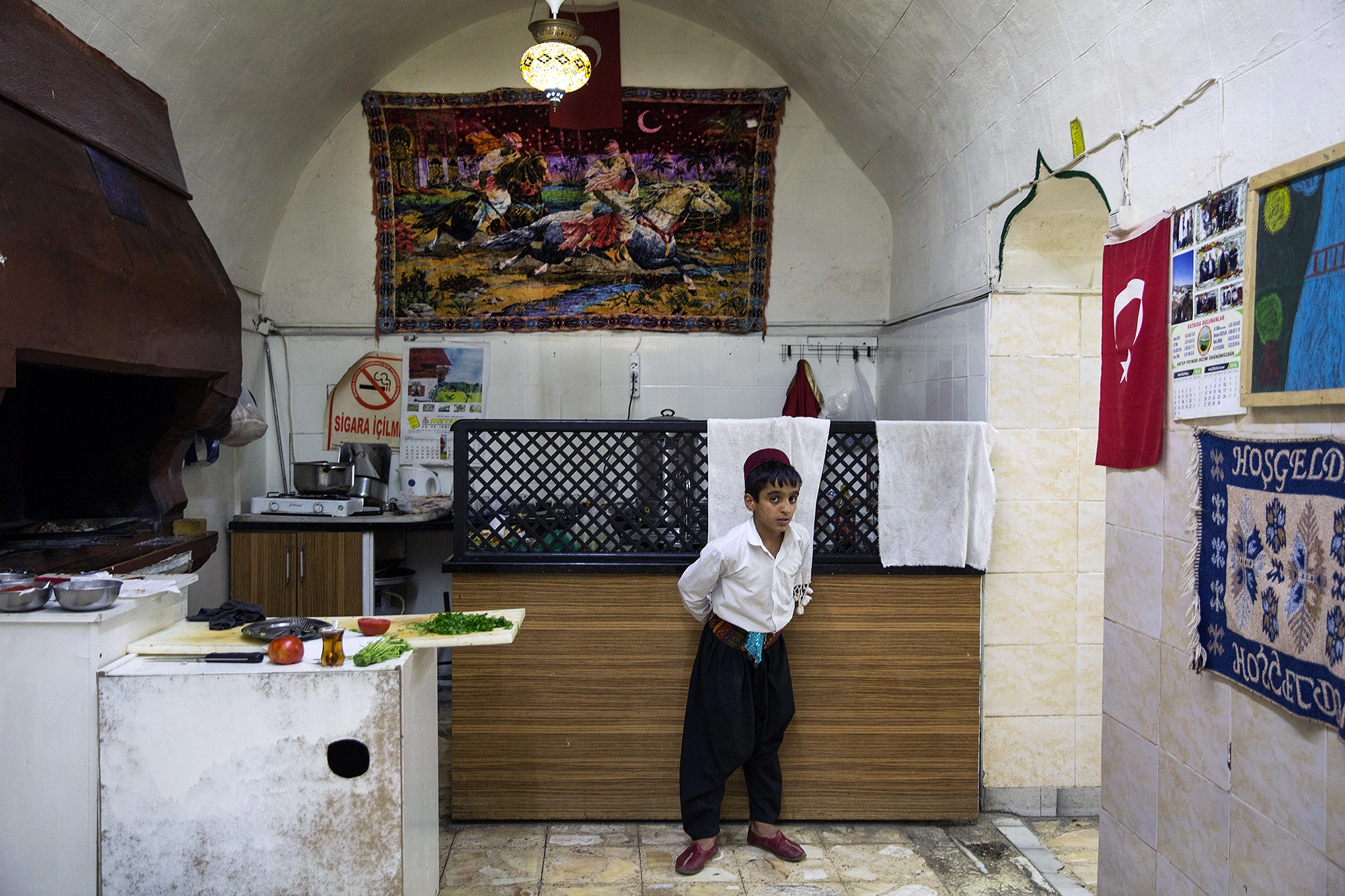 Ahmet, 11, refugiat din Aleppo, muncește la o terasă din centrul vechi din Gaziantep ca băiat bun la toate, pentru a-și susține familia. Primește aproximativ 35 de euro pe săptămână. Este o practică comună în oraș ca fiecare mică afacere de stradă să aibă un copil angajat. Sunt aproximativ 500.000 de refugiați sirieni în Gaziantep.