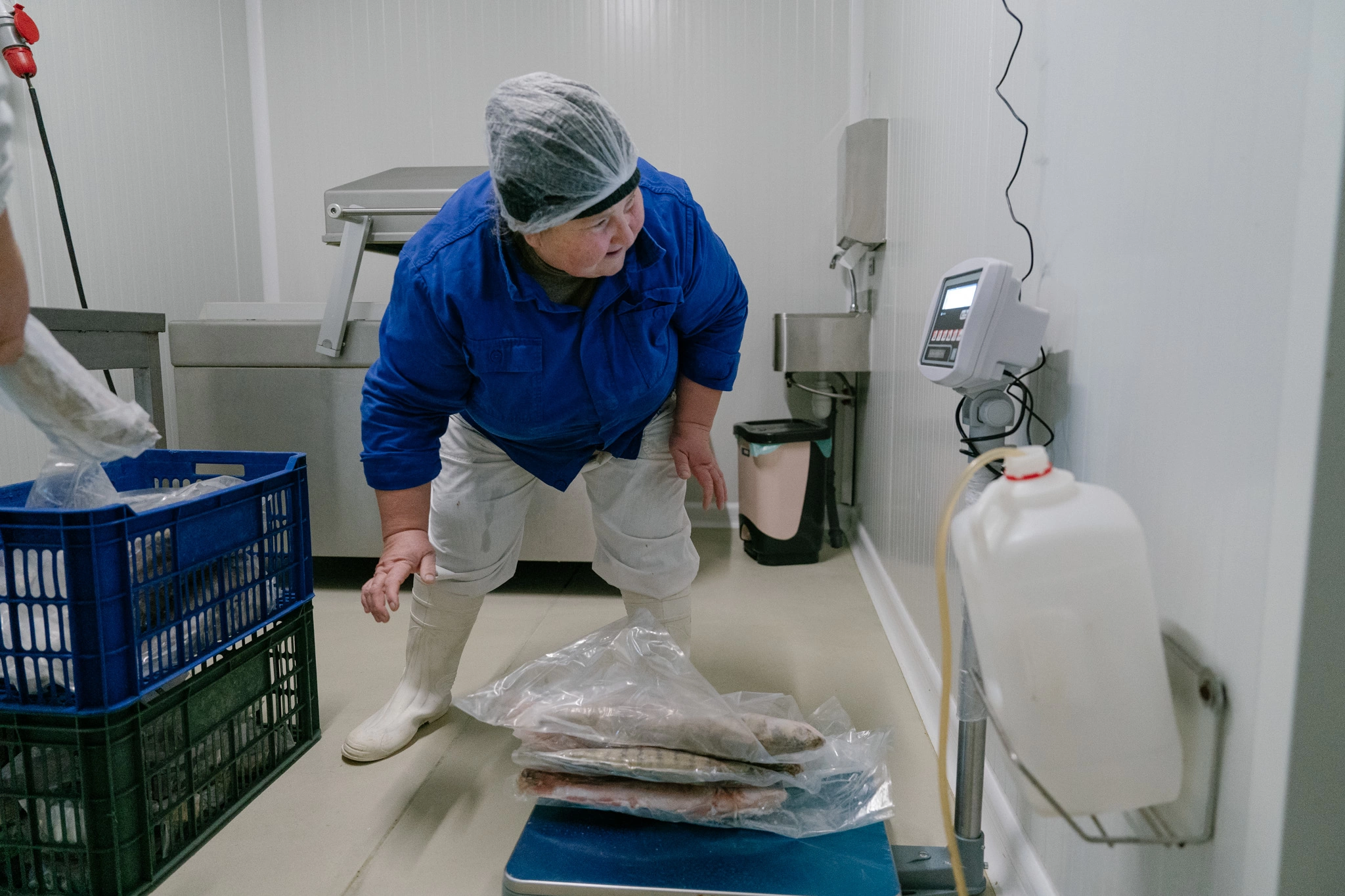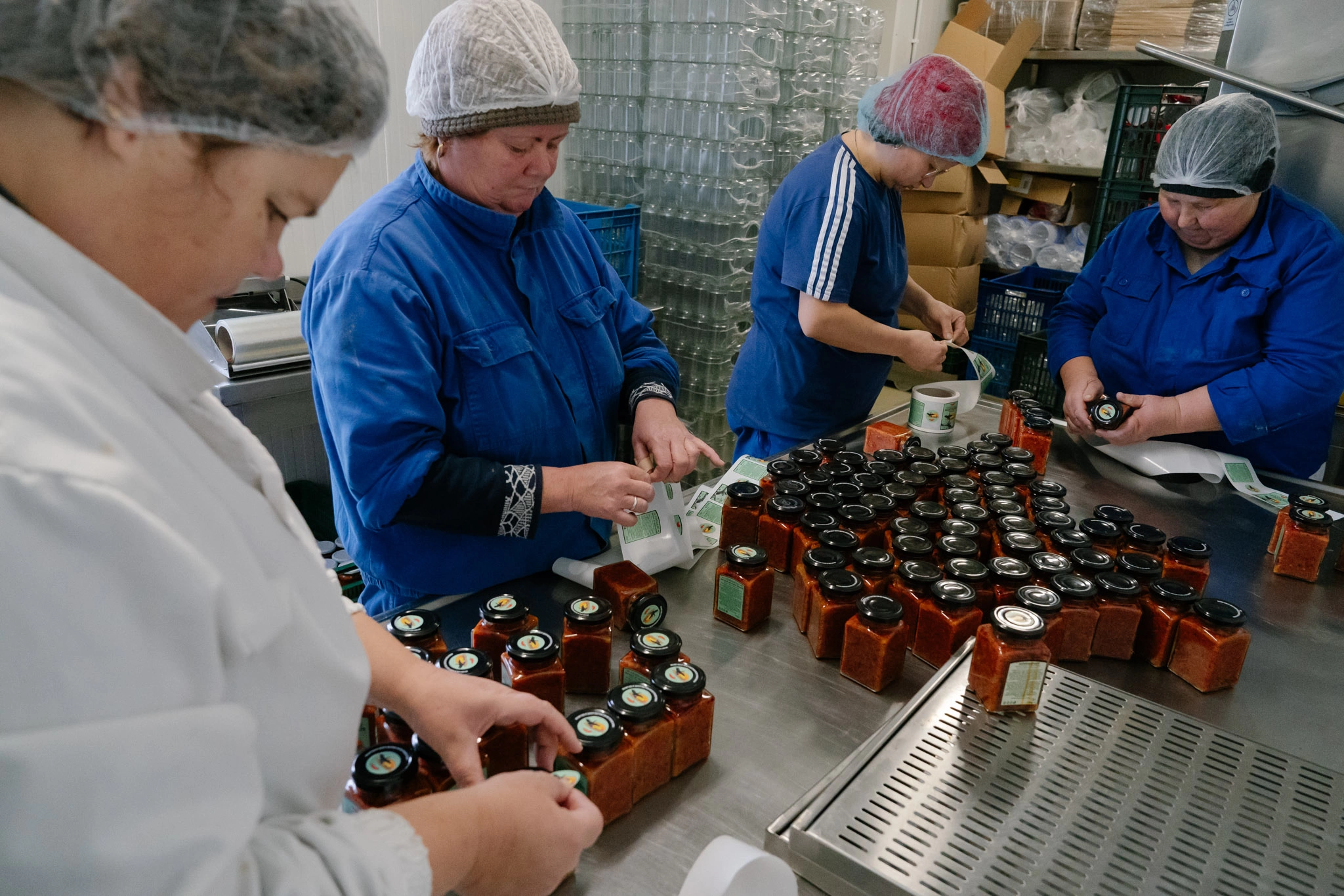 Vizavi de cherhanaua din port, într-una dintre încăperile micii fabrici, trei doamne cu capetele acoperite de bonete etichetează borcane. „Vedeta noastră este zacusca din pește cu bucăți de sturion”, spune Cristian Anisim, cel care se ocupă de coordonarea fabricii de produse pescărești.
