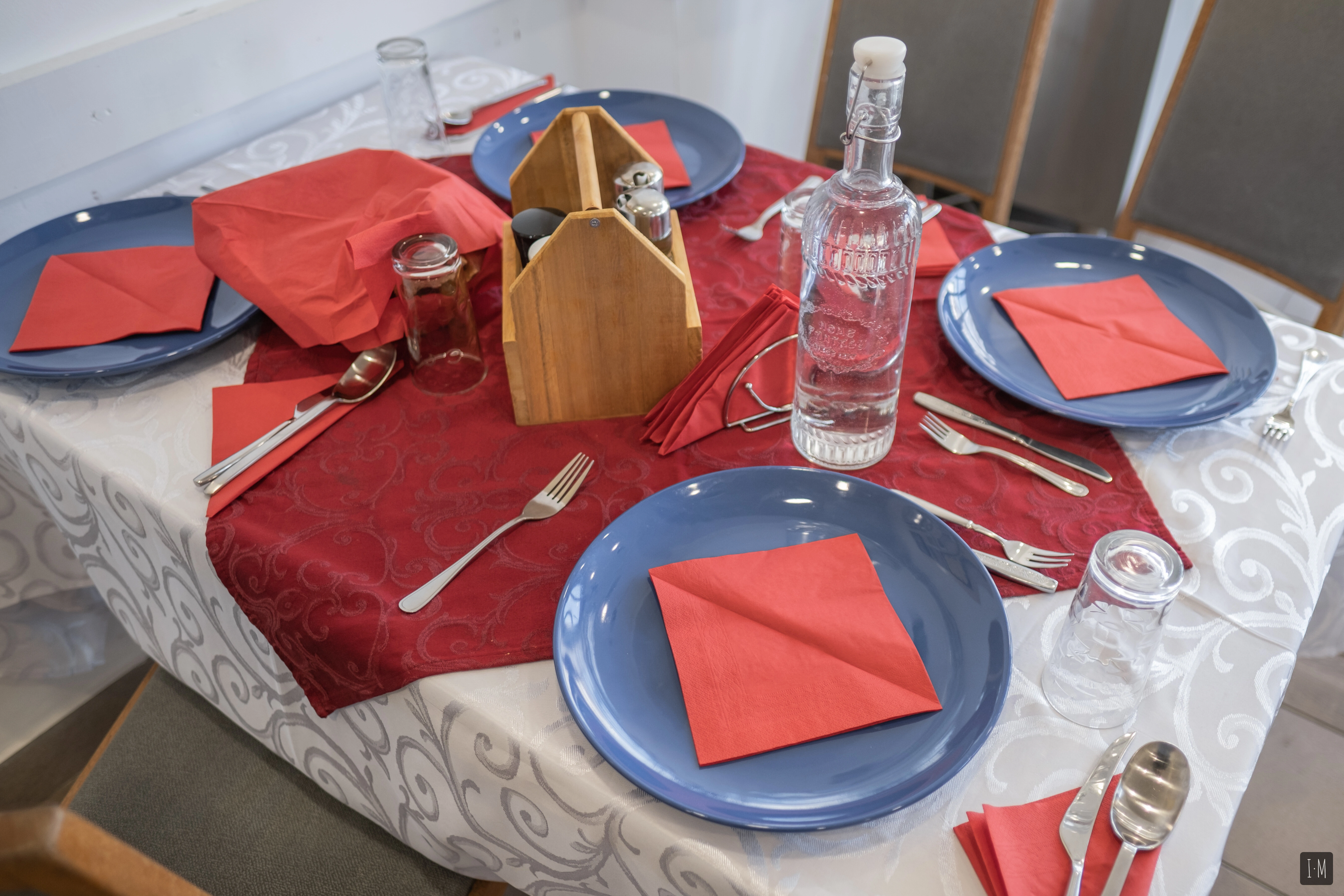 Un bărbat cu părul atent aranjat, în sacou maro și cămașă albastră, își aruncă privirea atentă prin sala restaurantului, asigurându-se că totul este pregătit conform instrucțiunilor sale. Studiază cu atenție fiecare masă: în centru tronează oliviera din lemn, iar pe margini stau aliniate farfurii întinse albastre. Furculițele așteaptă cuminți în partea stângă a farfuriilor, iar în dreapta sunt așezate, pe șervețele roșii, lingurile și cuțitele. Mai avem paharele, cel puțin o sticlă cu apă plată și, dacă mai e loc, în funcție de meniu, câte o vază cu flori de sezon.