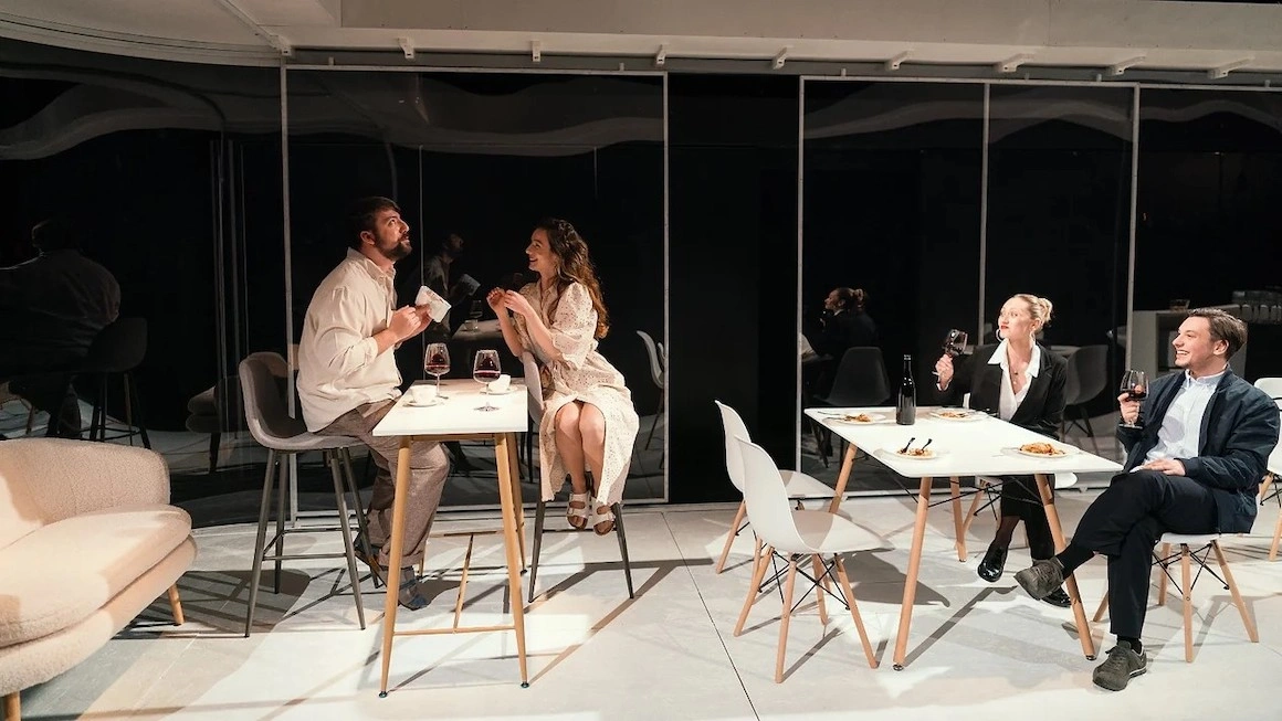 Cațianis deschide și spectacolul, cu un monolog de Neil LaBute în care personajul are o fantezie cu o femeie necunoscută pe care o vede la bar (Camelia Paraschiv Kátai). Femeia, care nu vorbește în această scenă, reapare în scena finală (poate cea mai puțin reușită din spectacol pentru că pare neterminată narativ), ca o mamă singură care, determinată de o problemă parentală, vine să ceară ajutorul tatălui fiului său (tatăl – Costi Apostol, glisează între șoc, vină, negare și relația complicată cu propria soție). Femeia pică mai cu voie, mai de nevoie, ca o bombă în mijlocul unei petreceri în care (alte) două cupluri (Alexandrina Ioana Costea – Costi Apostol, Mona Codreanu – Daniel Rizea) tocmai și-au fracturat (și) ele relațiile, atât de prietenie, cât și cele casnice. Ce unește poveștile este dinamitarea status quo-ului, faptul că premisa relațiilor dintre personaje este detonată neașteptat printr-o narațiune cu tușe absurde și comice, fie în direcția distrugerii, fie în cea a coagulării în formule surprinzătoare. Spectacolul este spumos, l-aș numi „fâșneț”, cu partituri de joc ofertante, pe care actorii TAM le înhață abil și le transformă în mici nestemate.
