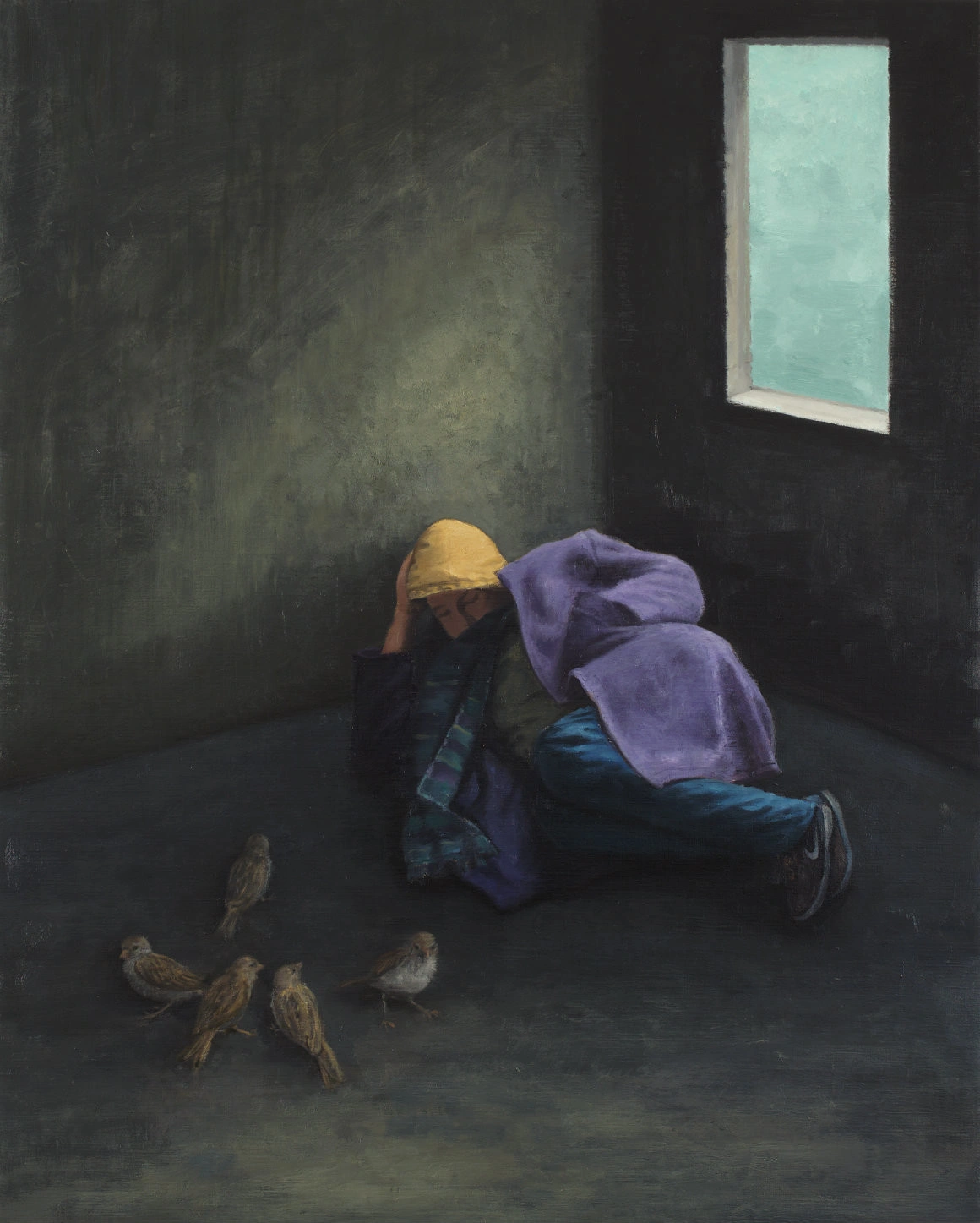 Era un om al străzii pe care îl văzusem întâmplător, în timp ce urcam niște scări într-o clădire. Avea o căciulă galbenă ca o aureolă. Stătea într-un colț și dormea acolo. M-am trezit cu pictura sub nas, ceea ce rar se întâmplă. Am făcut fără să vreau o conexiune cu pictura lui Giotto în care Sfântul Francisc hrănește păsările și așa s-a născut pictura. A fost o clipă de inspirație. Pentru mine aceste momente necontrolate sunt cele mai importante. Probabil ele sunt multe, dar reușești să prinzi doar câteva. Trebuie să ai mintea ori foarte limpede, ori tulbure să le prinzi. Se întâmplă și noaptea să ai o idee. Se întâmplă și nu știi din ce motiv, dar îți dorești aceste clipe mai des. Astfel de episoade te provoacă și te iluminează.