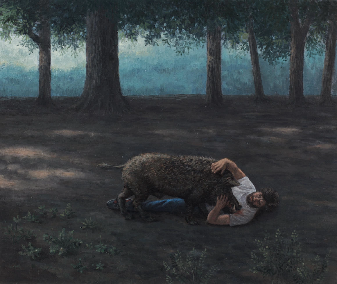 Pentru mine, cele două stări sunt diferite. Ideea și exaltarea în fața unei idei și a fi inspirat de asta e un sentiment diferit de ceea ce fac în atelier. Ideea e vie în capul meu, dar a-i da forma potrivită ține de alt proces. Lucrând, mă gândesc la alți artiști, la un limbaj, la diferite rezolvări. Limbajul este ceva la care mă uit încontinuu și mă inspiră de multe ori. E un proces de acumulare, în fond. Lucrând în fiecare zi îți dezvolți instinctele. De multe ori, mă simt ca un animal care vânează din ce în ce mai bine. Așa suntem construiți, să avem posibilitatea de a ne îmbunătăți mereu. În cazul picturii, e puțin diferit. Cum spunea Picasso: „La zece ani desenam ca Rafael și toată viața m-am chinuit să desenez ca un copil”.