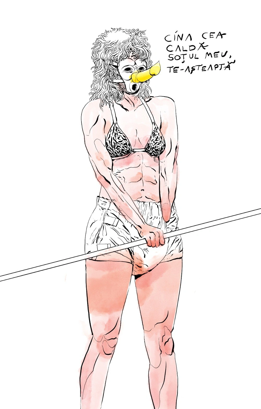 Ce-mi atrage atenția: Două mini „aparate de masaj” în formă de pisicuță, pe roz și pe alb - se numesc I Rub My Kitty („îmi frec pisicuța”). Un costum de gimp – cuvântul denumește un fetiș în care îți place să te îmbraci din cap până în picioare în latex, cu tot cu mască. Ăsta de aici e cafeniu și se cheamă Phantom („fantoma”). Mai e, apoi, și Soft Giant, „uriașul moale” un alt penis masiv, de 40-50 de centimetri, cu un nume care nu inspiră neapărat maratoane sexuale. Stau și mă întreb la ce-ai putea să folosești așa ceva. Recuzită pentru video-chat? Decorațiuni interioare contemporane? În colțul cu „daruri haioase” se află păpușa gonflabilă Katy Pervy, „Katy perversa”, modelată să semene cu vedeta pop Katy Perry, precum și un cowboy gonflabil pentru doamne. Cireașa de pe tort e un penis cu cercuri colorate, pe care să le arunci de la distanță peste el – când eram mică aveam o jucărie cu o rață și cercuri, principiul era același.