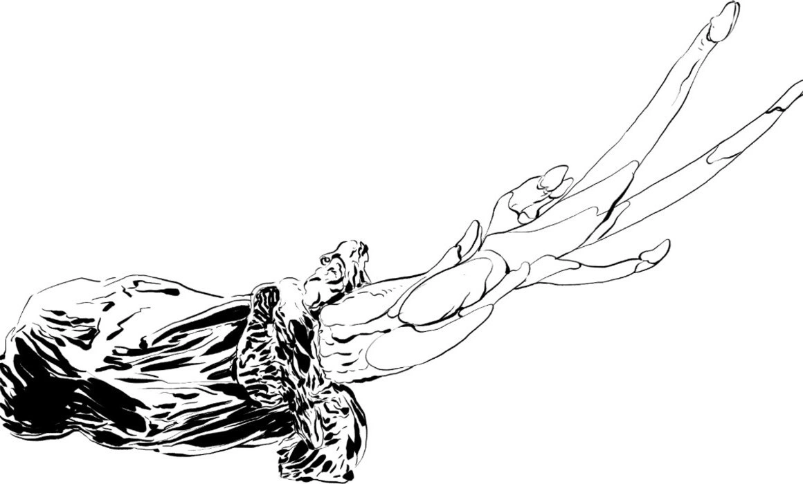 Într-o curte interioară, o ușă discretă e luminată cald de sus, ca să dezvăluie imaginea creată digital a unei femei înger, în lenjerie albă și cu aripi ample, înfățișată în decorul unui posibil palat neoclasic.