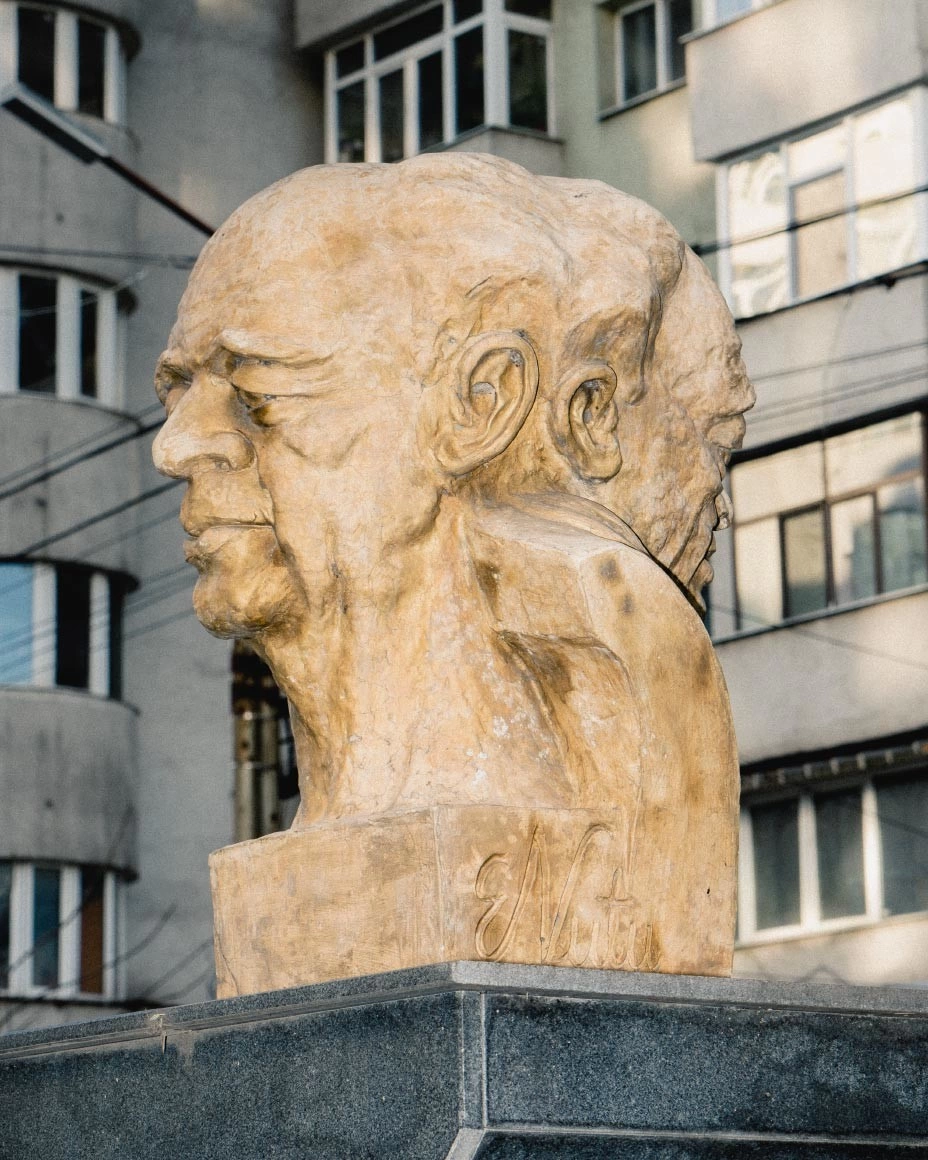 Se face deja trei când ajungem la Centrul Cultural Ionescu, pitit la parterul unui bloc între un sediu Telekom și un magazin de haine POEMA. În dreptul intrării, pe un scuar, e și un bust al lui Ionescu cu două fețe, una îndreptată spre instituția care îi poartă numele, cealaltă spre o covrigărie.