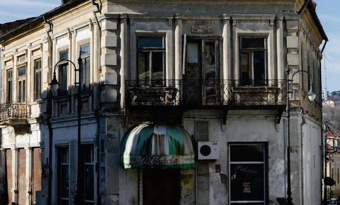 Când ajung în centrul istoric al Slatinei, am impresia că am nimerit într-un decor de film. Un fel de In Bruges, doar că pe dos. Clădiri în paragină cu tencuială căzută, firme vechi și geamuri sparte.