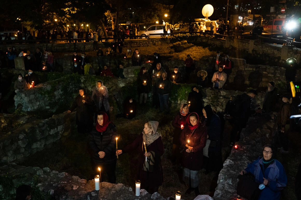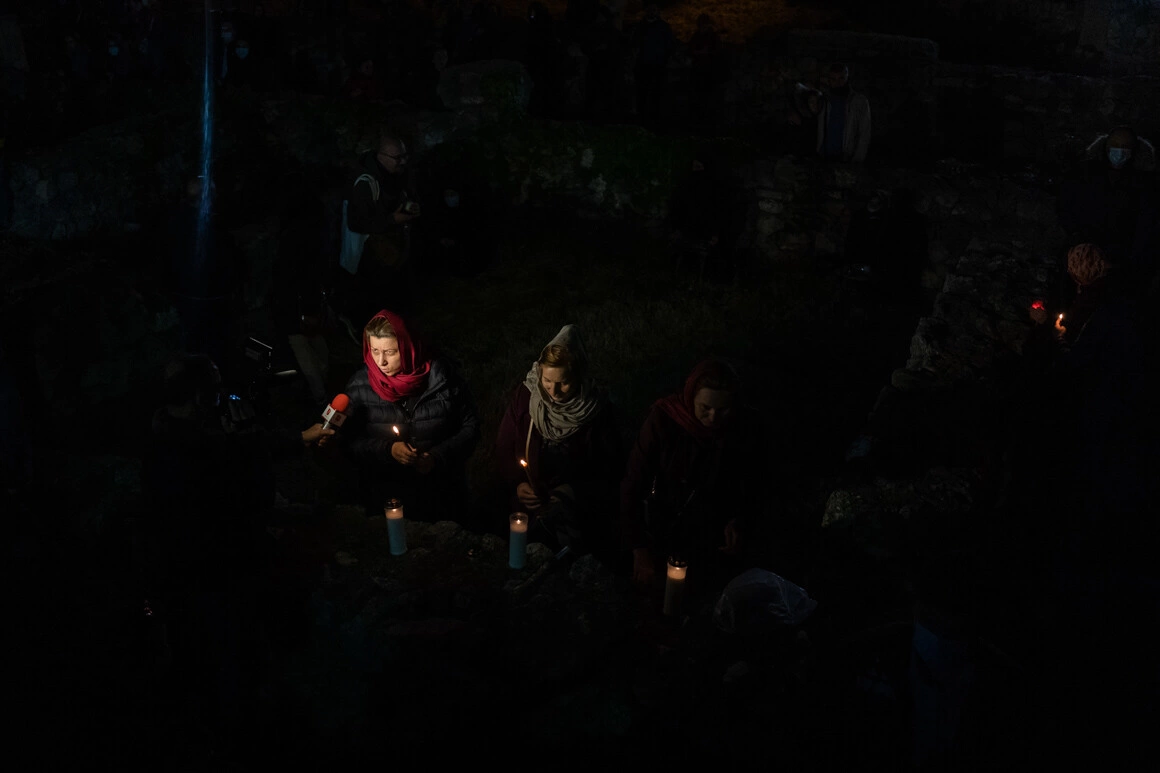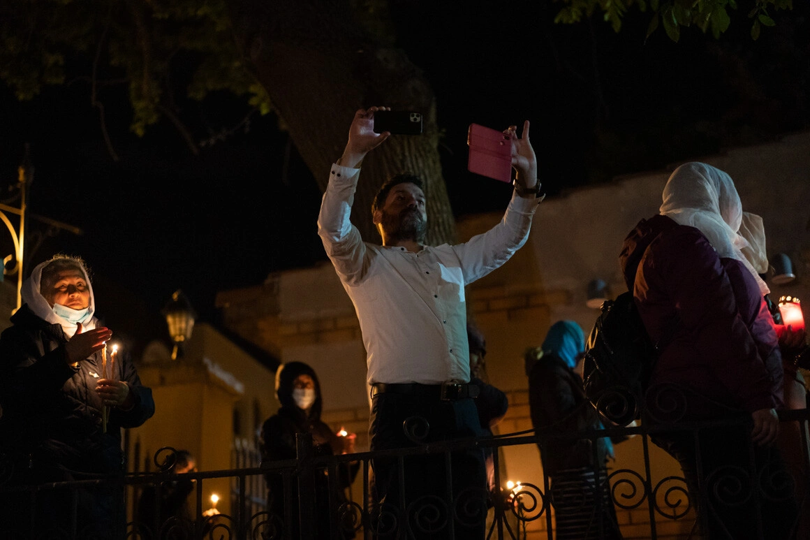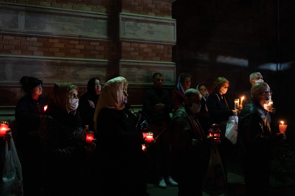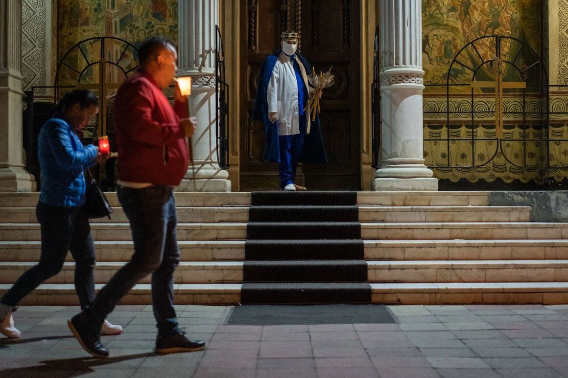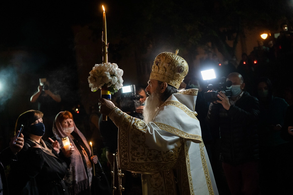 „Vă rog să păstrați distanța și regulile sanitare!”, spune arhiepiscopul Teodosie din mijlocul unei scene montate pe latura sudică a catedralei Sfinții Apostoli Petru și Pavel din Constanța. Lavaliera ascunsă în hainele bisericești împrăștie mesajul din boxe peste zidurile fostei cetăți Tomis, unde câteva sute de credincioși s-au adunat să ia parte la a doua slujbă de Înviere din acest an.