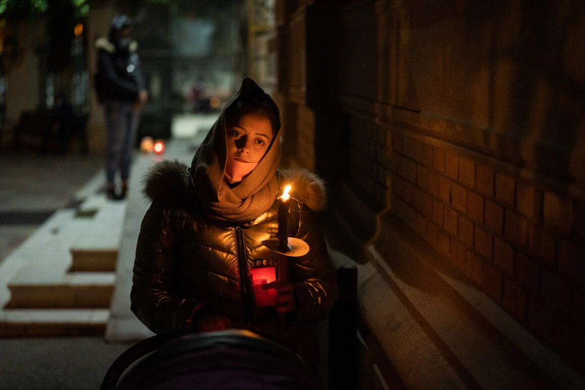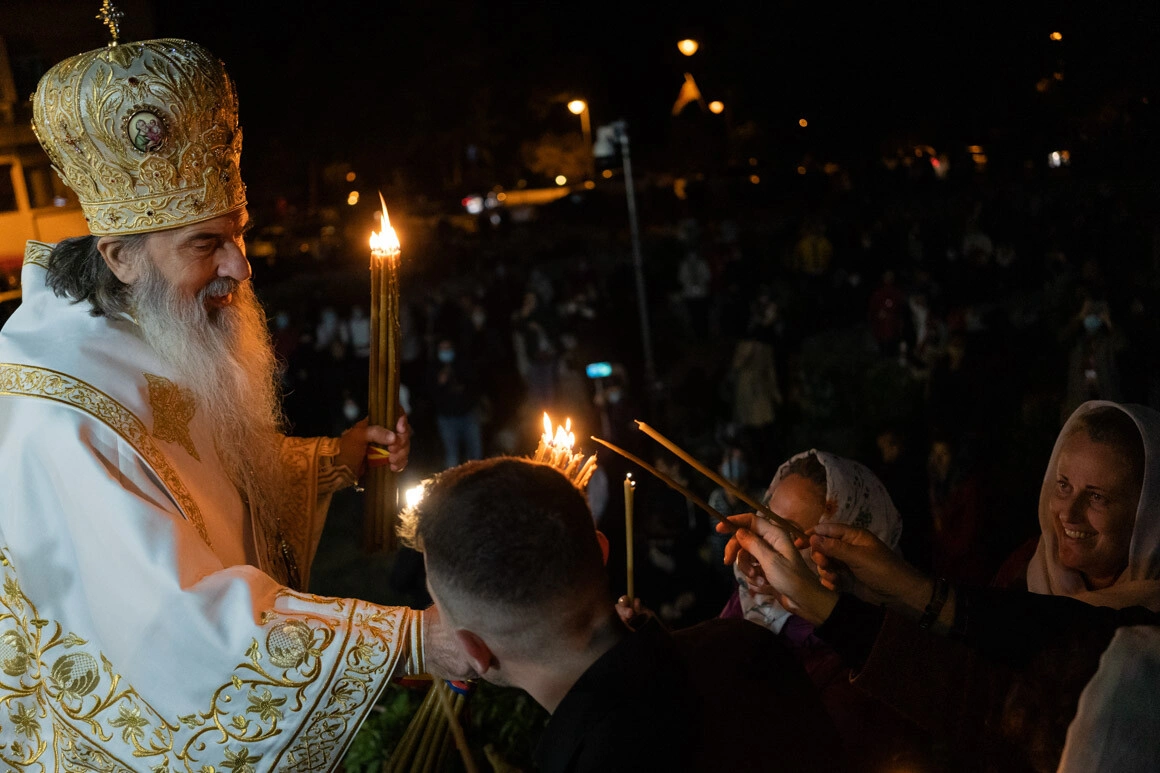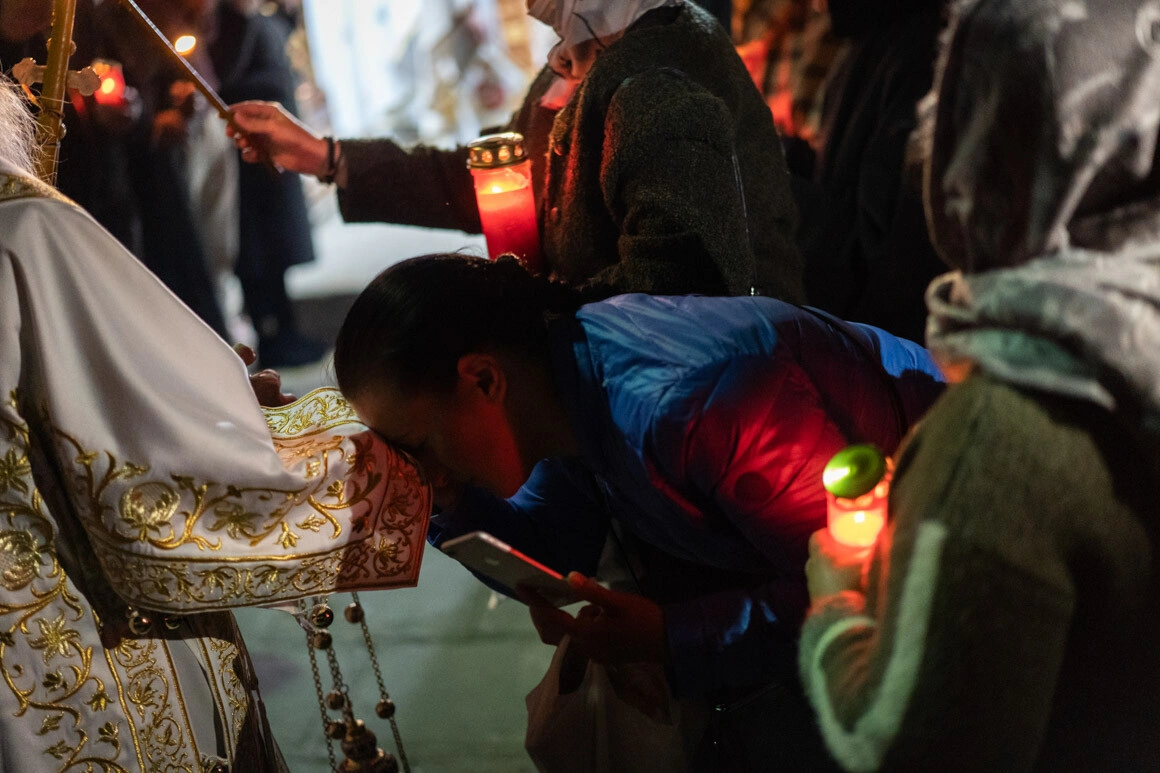Cu puțin înainte de miezul nopții, Teodosie reia apelul la distanțare socială și reguli sanitare, după care împarte lumina către preoții de pe scenă și lansează creștinescul „Veniți de luați lumină!”. Curajoși, preoții se avântă în mulțime, conduși de arhiepiscop, fără mască sau orice urmă protecție lumească. Oamenii se adună puhoi în jurul lor, câte șapte, opt la o lumânare. Unii cu măști, pe față sau pe gât, alții fără. Preoții nu discriminează pe criterii sanitare, împart la toată lumea.