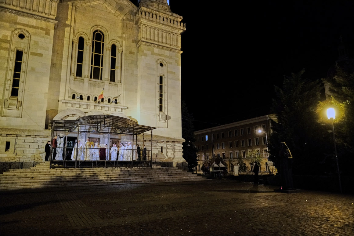 O săptămână mai târziu, aproape de apogeul anunțat al pandemiei în România, sunt primit de greco-catolici la Biserica Schimbarea la Față din Cluj-Napoca. Vegheat de statuia Cardinalului Iuliu Hossu, lăcașul este cufundat în întuneric până la începerea Slujbei de Înviere, la ora 23:00. Episcopul Florentin Crihălmeanu și lumânările preoților sunt singura sursă de lumină în preajma miezului nopții, când plec către Catedrala Ortodoxă.