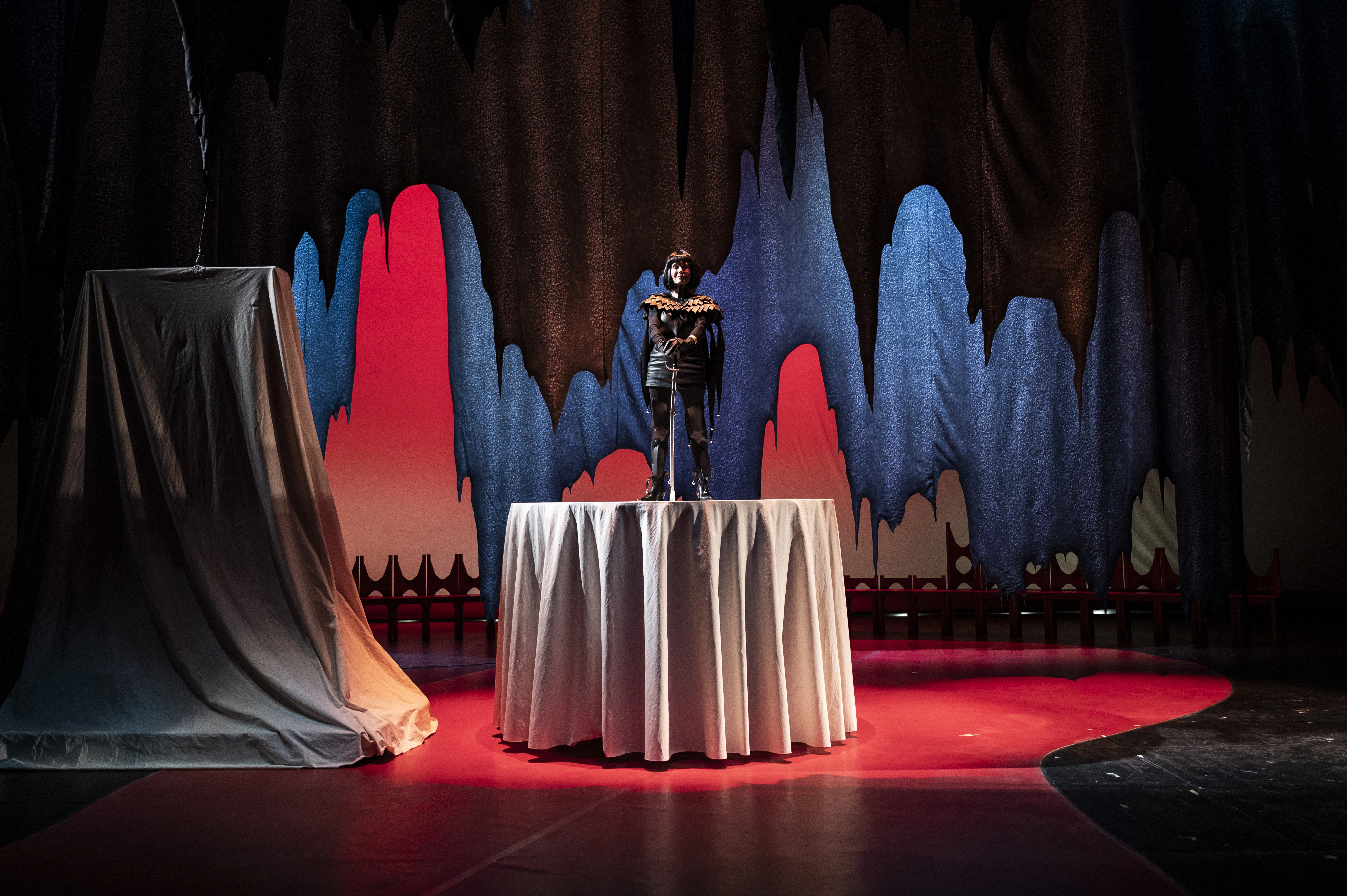 În funcție de lumina din sală, care prinde diferite culori, spațiul scenografic evoluează dinspre claustrare spre deschidere. Este construit anacronic, pentru că, spune artistul, nu e inspirat doar de teatrul baroc, ci și de filmele horror din perioada interbelică: „Seamănă cu ceva expresionist, dar e și un exemplu mai generic de historical fantasy, într-un mod care e legat de tot ce se întâmplă azi”. Acest fenomen se încadrează în ceea ce filosoful Zygmund Bauman numește retrotopie, utopia trecutului idealizat, în care oamenii caută refugiu în percepții nerealiste și idealizate ale trecutului, iar viitorul își pierde caracterul dătător de speranță, și ea, la rândul ei, o formă de „fantasy social sau politic”. Referințele anacronice și fanteziste sunt utilizate în perioadele de criză, fie că vorbim despre romantism – dezvoltat în epoca industrializării și a discuțiilor despre identitate națională din secolul XIX – sau despre alunecarea spre fascism a Europei în momentul impunerii absolute a statului național din perioada interbelică. Ambele perioade au fost construite pe narațiunea unui trecut glorios și a unui prezent decăzut. Implicit, se aplică și acum, când valul de neofascism se folosește de multe ori de un vocabular din zona fantasy, de la Stăpânul Inelelor la jocuri video, pe fondul acceleraționismului tehnologic actual. Aceste întoarceri către fantastic coincid de multe ori cu acțiuni violente.