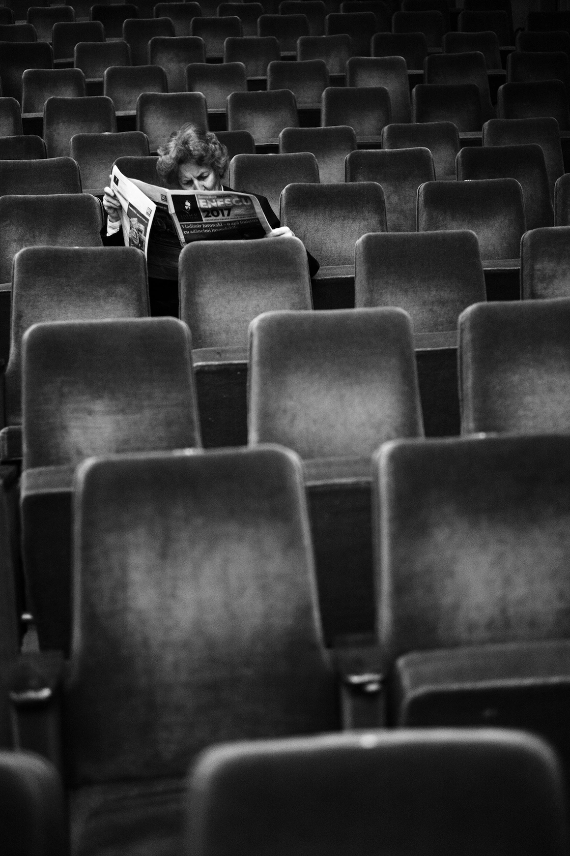 Acum câţiva ani am fost la un concert la Sala Radio, dirijat de Iurie Florea, cu aparatul pe film la mine. Am ajuns mai devreme, așa că încet-încet am început să observ oameni pe care nu prea îi vedeam pe străzi. Ținutele, cel puțin, îi făceau deodată mai vizibili. Mi-am dorit încă de pe-atunci să pot documenta spectatorii care vin la evenimente de felul acesta. Așa că de-a lungul ultimelor săptămâni, cât a ținut Festivalul George Enescu, am mers aproape zi de zi la Sala Palatului, pentru a prinde în fotografii lumea de dincoace de scenă. Cam asta a ieșit: