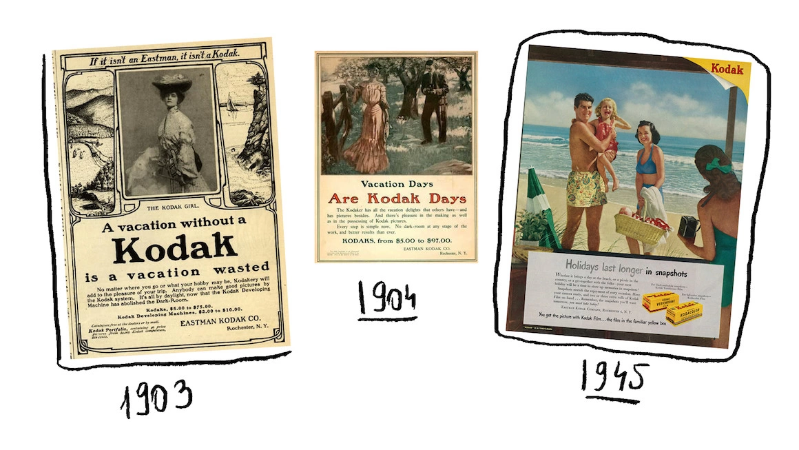 Internetul zice că, pe la 1870, primii fotografi itineranți din SUA se duceau la plajă sau la târguri de duminică, unde își fotografiau clienții pe negative de sticlă sau metal, pentru care trebuiau să aștepte aproximativ 5 minute. Mai târziu, au început să le vândă turiștilor fotografii pe hârtie. Și, odată ce aparatele foto portabile au început să devină tot mai accesibile pentru publicul larg, simbioza dintre călătorii și fotografie a fost exploatată din plin. Uite, spre exemplu, cum arătau reclamele Kodak acum mai bine de o sută de ani: