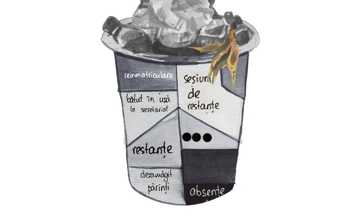 La Engleză-Română mi-a plăcut cel mai mult. Locul meu preferat era lângă coșul de gunoi din sala 328. De ce? Pentru că era locul cel mai apropiat de ușă și voiam să fiu primul care iese din sală. Toată studenția mi-am petrecut-o cu un picior în afara sălii de curs și cu celălalt așteptând să iasă. Uneori, literalmente. Oamenii erau atât de obișnuiți cu prezența mea lângă coșul de gunoi, încât li se părea că sunt o extensie a sa, un fel rudă umană sau vreun înger păzitor al coșurilor de gunoi.