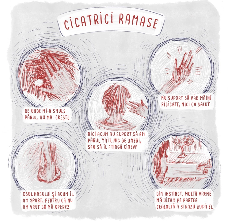Până când am început să ne amintim momente violente din adolescența noastră pe care le uitasem complet. Prietena mea din generală a fost lovită în fața mea, iar eu nu am reacționat. Eu am fost bătută în curtea liceului cu brutalitate și nimeni nu a reacționat. Oameni din jurul nostru, de vârsta noastră, au început să se deschidă, să ne vorbească despre experiențele lor de abuz, doar pentru că auzeau că lucrăm la proiectul ăsta.
