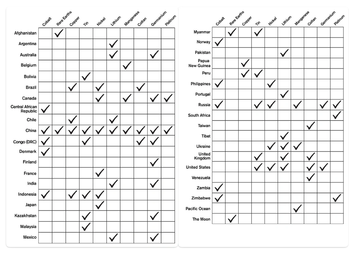 Realitatea este că în spatele geopoliticii extractivismului și a comerțului cu minereuri se află oameni prost plătiți și exploatați care își riscă viața pentru ca noi să putem alimenta mașini electrice și turbine eoliene (pământuri rare), să stocăm energie în fel și chip (nichel), să ne încărcăm bateriile telefoanelor mobile (cobalt), să vibreze telefonul (coltan) în timp ce citim un text pe un ecran luminos (pământuri rare), să folosim criptomonede (cupru), să facem tranzacții financiare care trec prin cabluri acoperite cu germaniu, să construim poduri, trenuri și clădiri (mangan) și lista continuă.