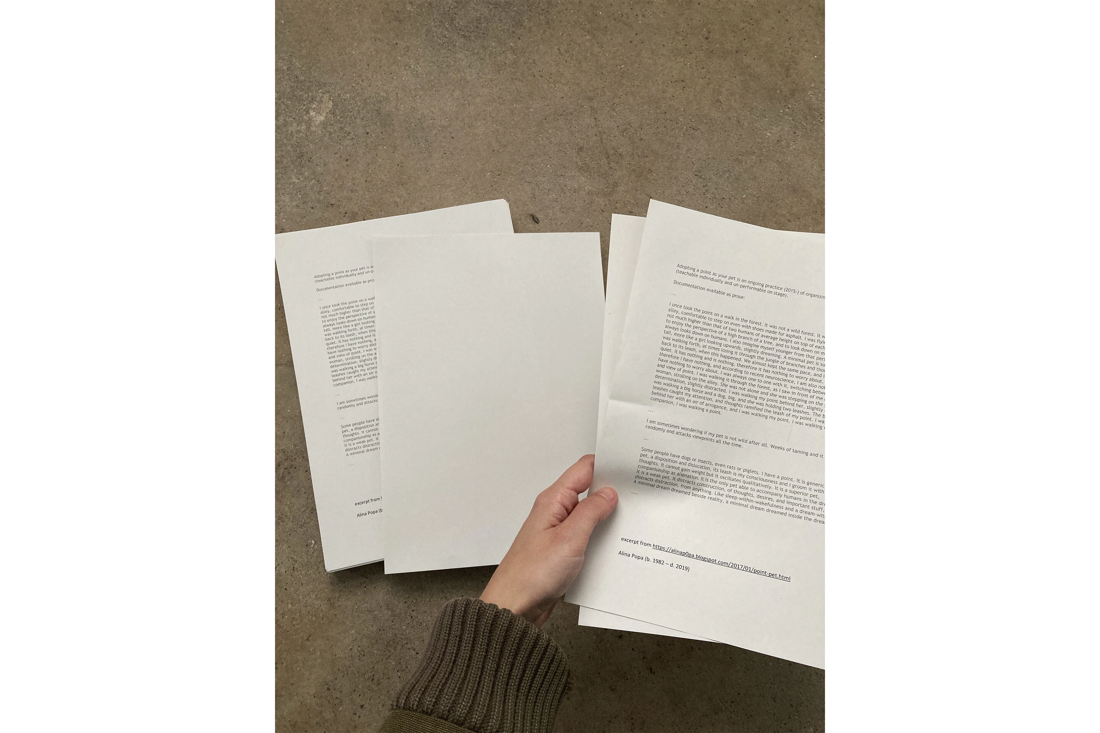 Point Pet, lucrarea Alinei Popa, este documentația unui text (musai de citit), în baza unei practici performative care pornește de la adoptarea unui animal de companie abstract, punctul, și plimbarea acestui „tovarăș singular” printr-o pădure străbătută de-o alee.