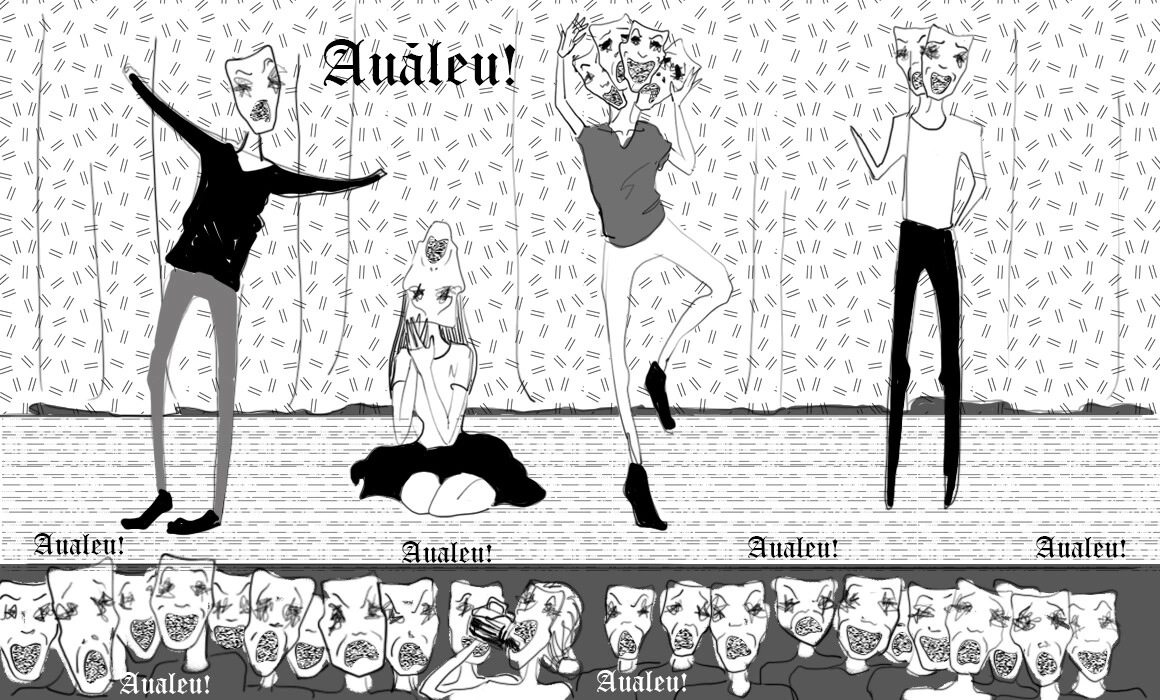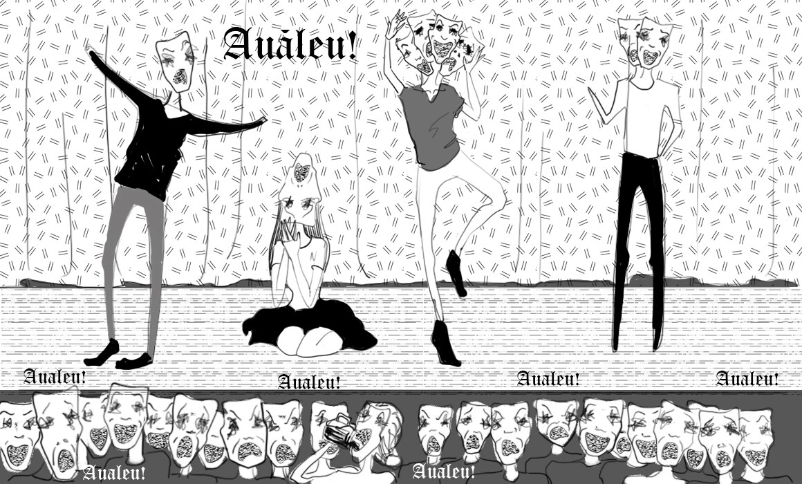 Se înnopta și am vrut să vedem un spectacol de teatru Auăleu. De obicei spectacolele aveau loc în bar sau prin împrejurimi. Se cunoștea ora, dar niciodată locul. Alteori era cunoscut locul, dar nu și ora. S-a întâmplat odată să nu găsească nimeni spectacolul și acesta să se desfășoare fără spectatori. Dar de ce li se spune Auăleu? E o poveste interesantă. Unul din actori mergea liniștit pe stradă, căutând inspirație pentru numele trupei, când dintr-o dată s-a împiedicat și a căzut. Au, a făcut el, și s-a uitat să vadă de ce s-a împiedicat - era o bancnotă de un leu. Au, a continuat actorul, iar prietenul său l-a întrebat ce ai pățit, bă?, iar actorul a zis au, ăăă, un leu?, nevenindu-i să creadă că s-a împiedicat de o bancnotă de un leu. Auăăăunleu? a întrebat al doilea actor. Auăleu, Auăleu, le-a strigat o trecătoare, care ieșise la jogging. Și de atunci așa s-au numit. Tot de atunci, toți membrii trupei poartă o bancnotă de un leu într-unul din pantofi, ca să le poarte noroc. Noi n-am reușit încă să găsim un spectacol al trupei, dar prietenii ne spun că merită văzute. Cică nu poți rezista tentației de-a striga Auăleu! la sfârșitul reprezentațiilor. Iar actorii și actrițele îți răspund de asemenea cu Auăleu!