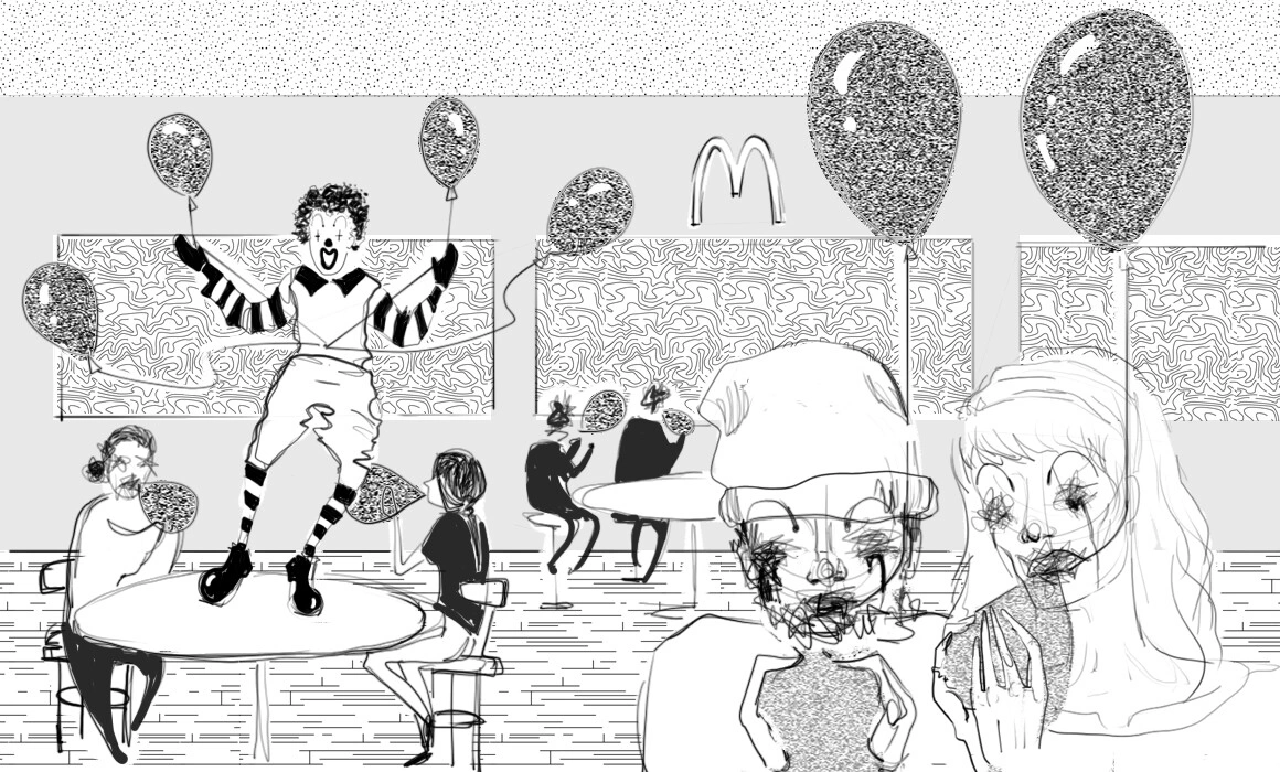 Desigur, în McDonald’s se poate și mânca. Lângă masa noastră, un copil înfuleca burgeri și cartofi prăjiți, lacrimi șiroindu-i pe obraji, pic-pic în paharul de Cola. Părinții lui stăteau de vorbă cu Ronald McDonald, clovnul care s-a născut în McDonald’s. Fiecare McDonald’s are un Ronald McDonald, dar nu toți sunt reali. Unii sunt doar actori. Dar Ronald McDonald din Timișoara e real. Singurul din România. Nu știm când sau cum s-a născut, acest lucru le este dezvăluit doar clienților fideli ai restaurantului, care păstrează secretul.