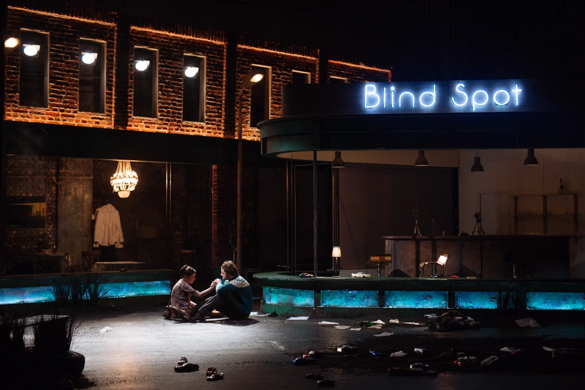Adrian Damian a transformat scena de la Ploiești în cel mai frumos tablou, emblemă a singurătății, care-a fost pictat vreodată. Nu era regizor mai potrivit decât Afrim să găsească un text care să rezolve ecuația asta vizuală. Afrim și-aduce în Punctul orb toată artileria de personaje vulnerabile, singure și pline de sensibilitate pe care le caută în tot ceea ce citește. Spectacolul e-o lume în miniatură a lumii noastre însingurate și pe alocuri fără de speranță.