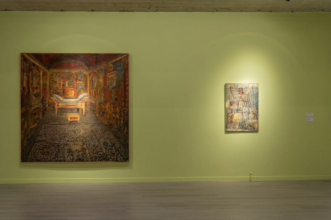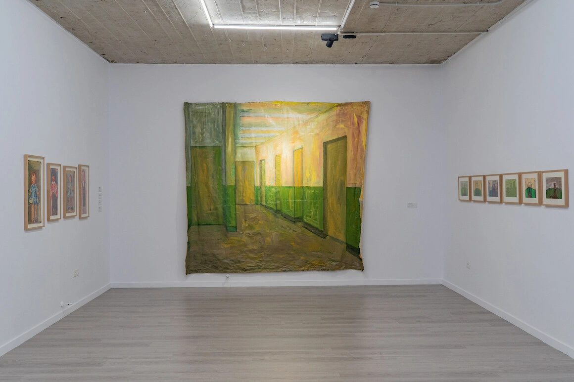 Există însă în expoziție un interior, tot al Ioanei Bătrânu, care e diferit. Nimic sopmptuos aici, nicio urmă personală, doar un coridor verde care ar putea fi din orice instituție, spital, școală, azil, închisoare. Genul de imagine care nu ți s-ar părea deloc nelalocul ei într-un vis care se transformă în coșmar, pe măsură ce încerci să găsești ieșirea dintr-un labirint în care toate ușile dau în același hol. Faptul că pânza e neînrămâtă, că pare că se desprinde de perete, că vine spre tine, cum spune Marincu, „îi conferă o materialitate aparte”. O materialitate și o viață, sigur, puțin neliniștitoare, dar viață. „Mi se pare important ca publicul care privește pictura să-i vadă inclusiv spatele, peticele, textura, imperfecțiunile. Ea în fiecare zi își modifică forma.”