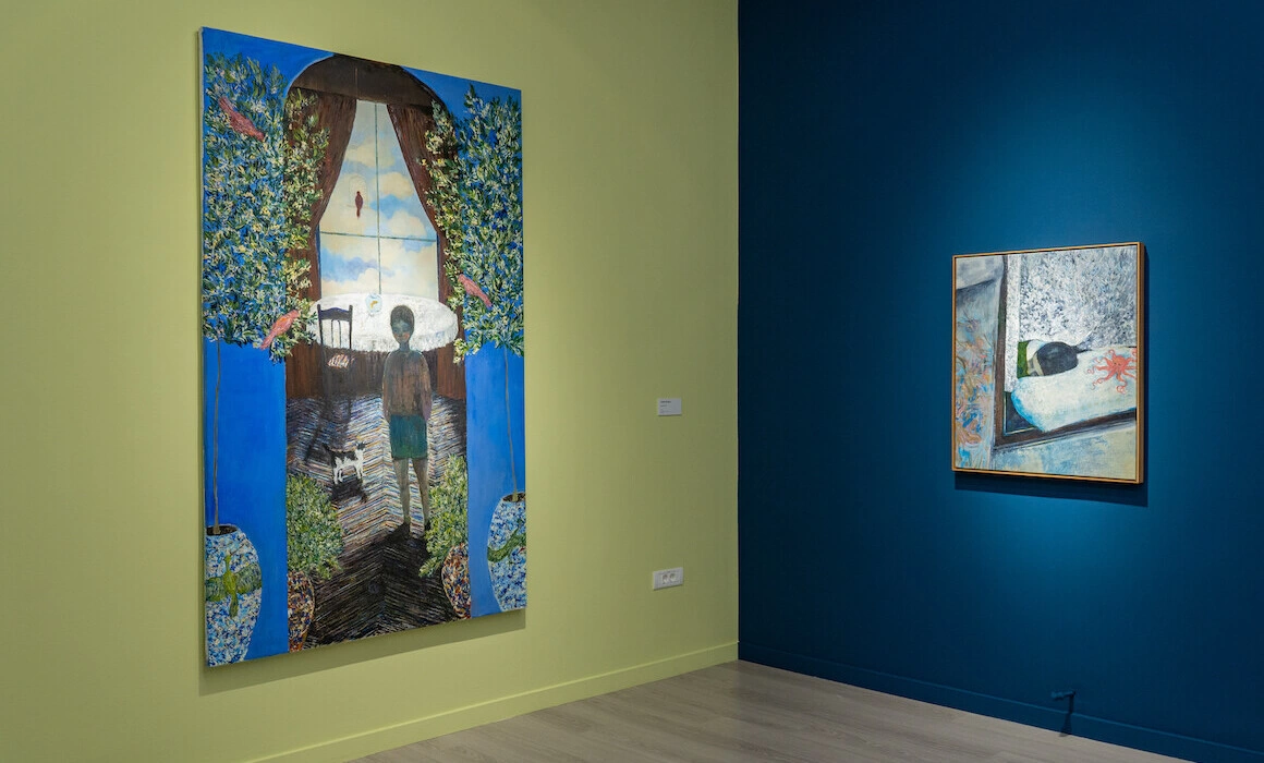 Când mă gândesc la expoziția Simetric, niciodată identic, pe care am văzut-o de curând la Timișoara, îmi vine în minte tabloul preferat al unei prietene, Lost but Found, de Adela Giurgiu, un tur de forță colorat în care fantasticul se simte, chiar dacă nu-l poți defini. Mai descriptiv: e un băiat postat în fața unor ferestre uriașe, alături de o pisică negru cu alb. Tu, privitorul, îi vezi prin niște pereți/perdele albastre aflate în spatele unor copaci de interior populați de papagali roșii.