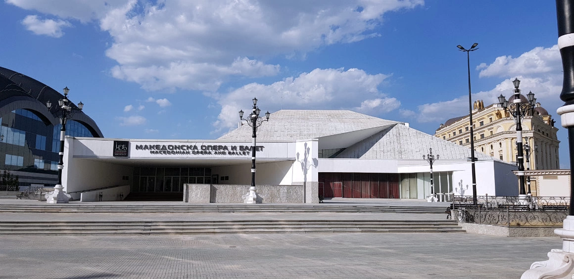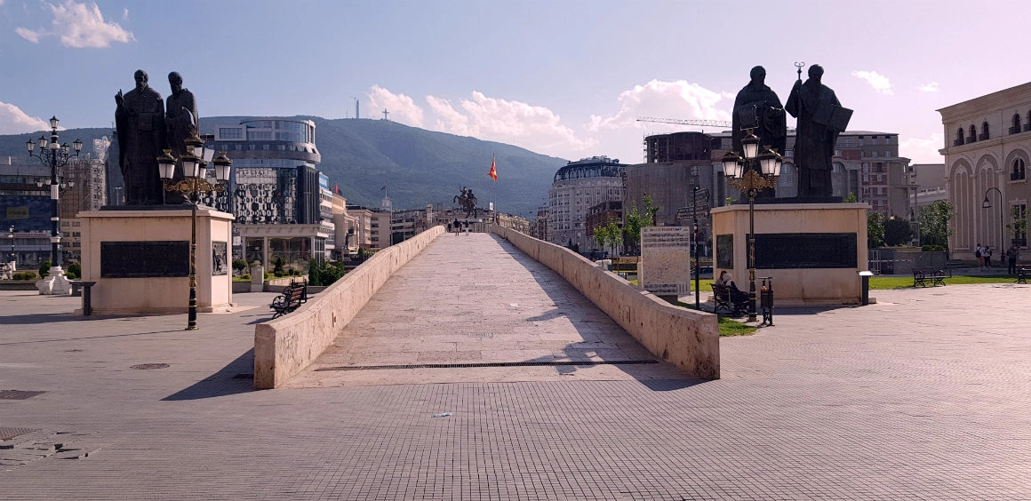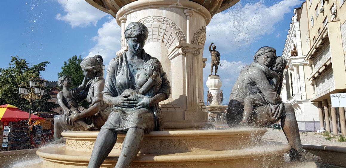 Sunt monumente publice peste tot. Toate cu personalități „locale”, cum ar fi Alexandru cel Mare, tatăl lui, Filip al II-lea Macedon și mama sa, Olympias. (Toți născuți în Macedonia din Grecia, desigur. Conflictul dintre cele două țări asupra folosirii numelui „Macedonia” are o lungă istorie, de câteva decenii deja.) Multe dintre monumentele din piața centrală au fost comandate de guvern una și aceleiași artiste, Valentina Stevanovska, care a și primit, cu ocazia asta, 2,94 de milioane de euro. Și Maica Tereza (albaneză, de altfel) e peste tot: statui, efigii cu ea, citate pe clădiri. Arhitectura e un amestec de brutalism (construcții care datează din anii de după cutremurul din 1963, care a demolat orașul), neo-clasicism și baroc (ca să ne demonstreze identitatea europeană a Macedoniei) și moștenire otomană (moschei, băi turcești, dar toate ascunse în spatele zidului de instituții noi „europene”, care au apărut pe malul râului în ultimii 12 ani).