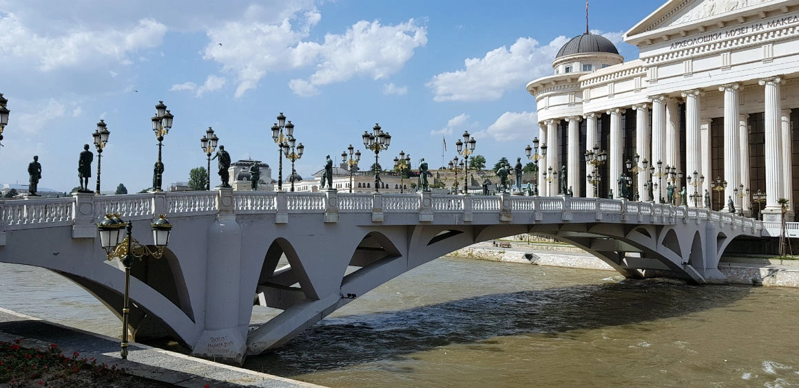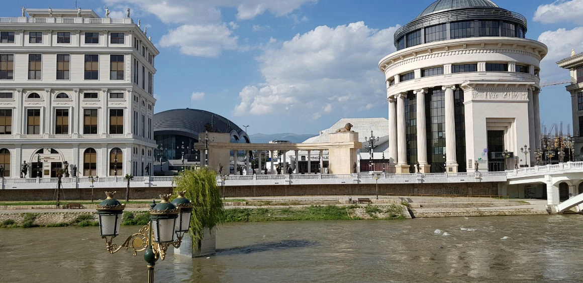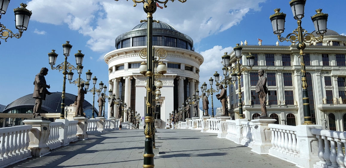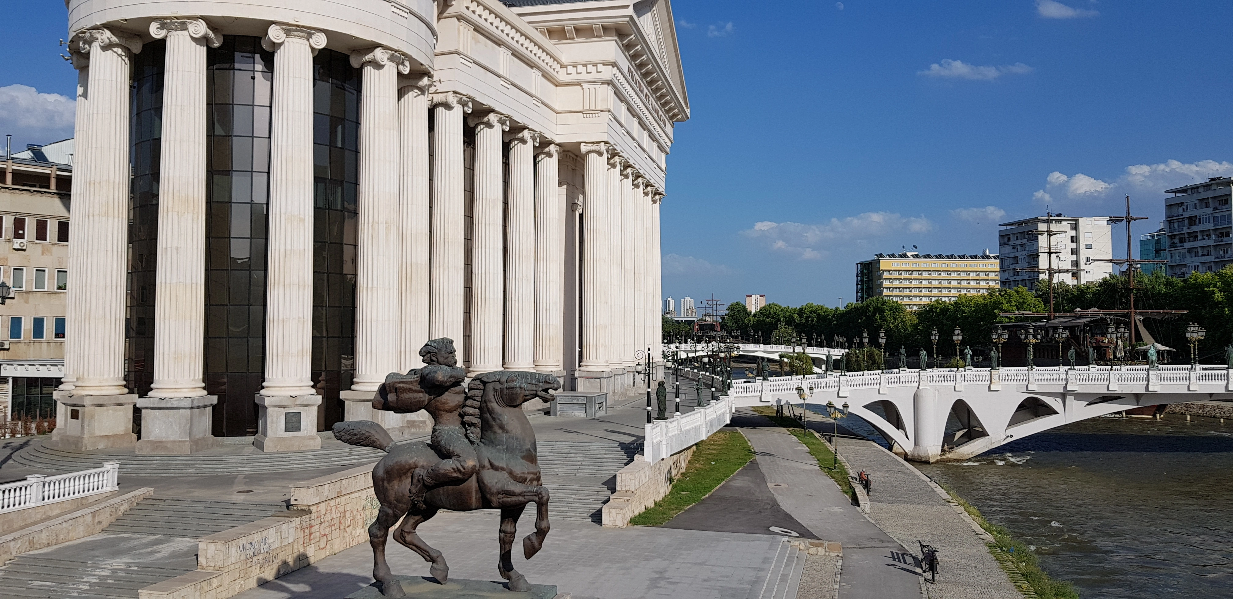 Toate aceste monumente, pe care macedonenii se feresc să le asocieze oficial cu Alexandru cel Mare din cauza unui lung conflict pe tema identității naționale cu Grecia, au apărut într-un proiect numit #skopje2014. A fost demarat în 2010 și și-a propus să redefinească centrul orașului în doar patru ani, exclusiv prin construcții neoclasice și baroce. Unde n-au putut să demoleze vechea moschee și o biserică de secol XVI, au tras în fața lor clădiri-paravan. Unele sunt aproape nefiresc de înguste, pentru că scopul lor evident e să mascheze adevărata istorie a orașului – ortodoxă, otomană, iugoslavă. Unde n-au putut să construiască ceva nou, cum ar fi pe clădirea Guvernului, au tras coloane, frontoane și alte elemente „nobile”. E greu să nu pierzi șirul a tot ce s-a construit, dar un site care ține socoteala spune că, deși în 2010 au fost anunțate 40 de structuri, în 2017 erau documentate 137 – printre care cinci piețe, o roată mare, 28 de clădiri, 34 de monumente, 39 de sculpturi, patru poduri, două fântâni și un arc de triumf (doar ăsta a costat 8 milioane de euro). Și altele.