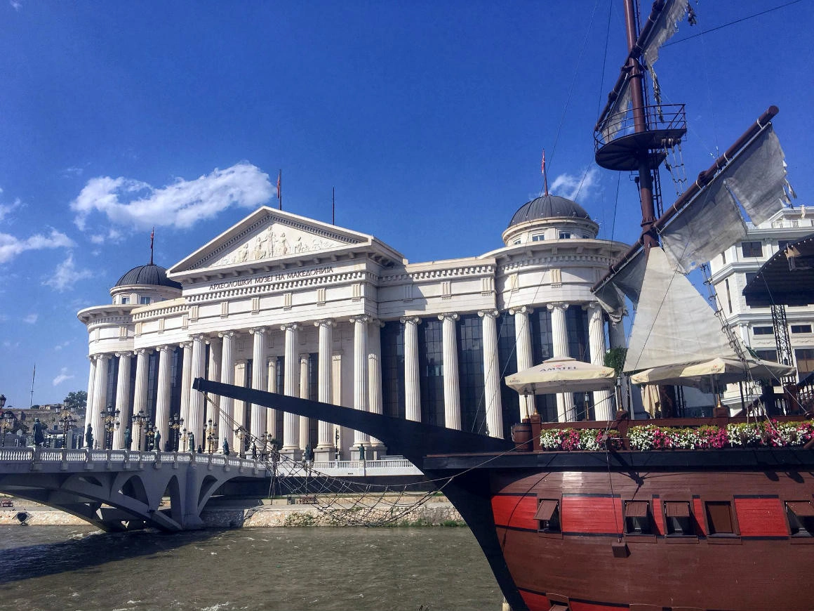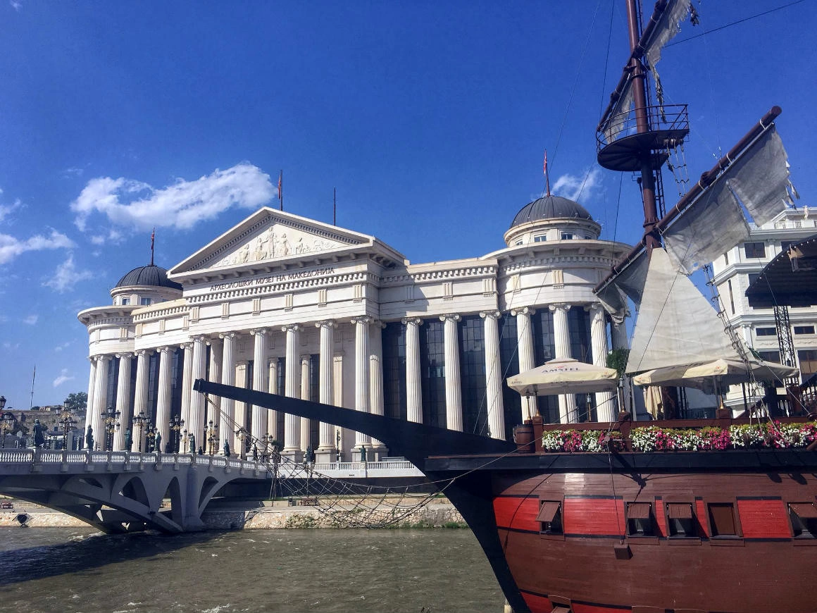 Îmi plac toate orașele cu apă, indiferent că-i râu, fluviu sau ocean, dar Vardarul care desparte Skopje în două fix prin centru e ceva deosebit. În primul rând, te frapează cele patru ambarcațiuni de pe mal – sunt construite în matca râului, așa că vor rămâne acolo pe veci. Sunt cafenele și restaurante, nu se știe cât au costat, dar ce e cert este că primarul le-a vrut în stil baroc. Răuvoitorii spun că arată mai degrabă ca-ntr-un parc de distracții cu tema Pirații din Caraibe.