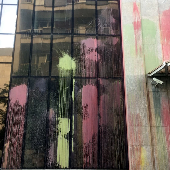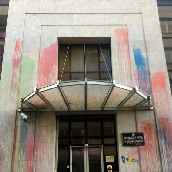 Premierul corupt a fost obligat de UE să-și dea demisia și a fost pus sub investigație. Numai că în 2016, președintele Gjorge Ivanov a anunțat că vrea să grațieze 56 de oameni implicați în scandalul cu înregistrările, printre care și pe Gruevski. În doar câteva ore de la anunț, macedonenii distruseseră biroul președintelui și vandalizaseră clădirile guvernamentale noi, ridicate prin #skopje2014. Au aruncat cu baloane cu vopsea, au tras cu pistoale cu apă umplute cu vopsea. Poate mai important, „Revoluția colorată” a fost una dintre primele dăți în istoria recentă a țării când macedonenii și albanezii au făcut front comun. Unul dintre liderii mișcării de-atunci, etnic albanez, le-a zis jurnaliștilor de la The Atlantic: „Țara asta n-a avut niciodată parte de niciun triumf. Deci când o să ne reușească mișcarea, o să putem să zicem că ăsta e un arc de triumf pe bune, un triumf împotriva [fostului premier corupt].” Grațierile au fost retrase, dar urmele de vopsea, ca niște lacrimi mari roz, mov, verzi, se mai văd și azi pe unele clădiri.