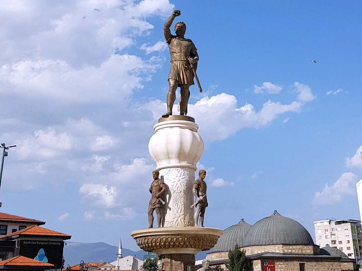 Înalt cât o clădire de opt etaje, „Războinicul pe cal” domină piața centrală din Skopje. Stă pe o coloană din fildeș, are 24,5 metri înălțime, e înconjurat de o fântână cu luminițe care cântă și are patru lei de bronz la picioare. A costat 7,5 milioane de euro, și deși toată lumea îi zice „Alexandru cel Mare” autoarea se jură că nu-i el.