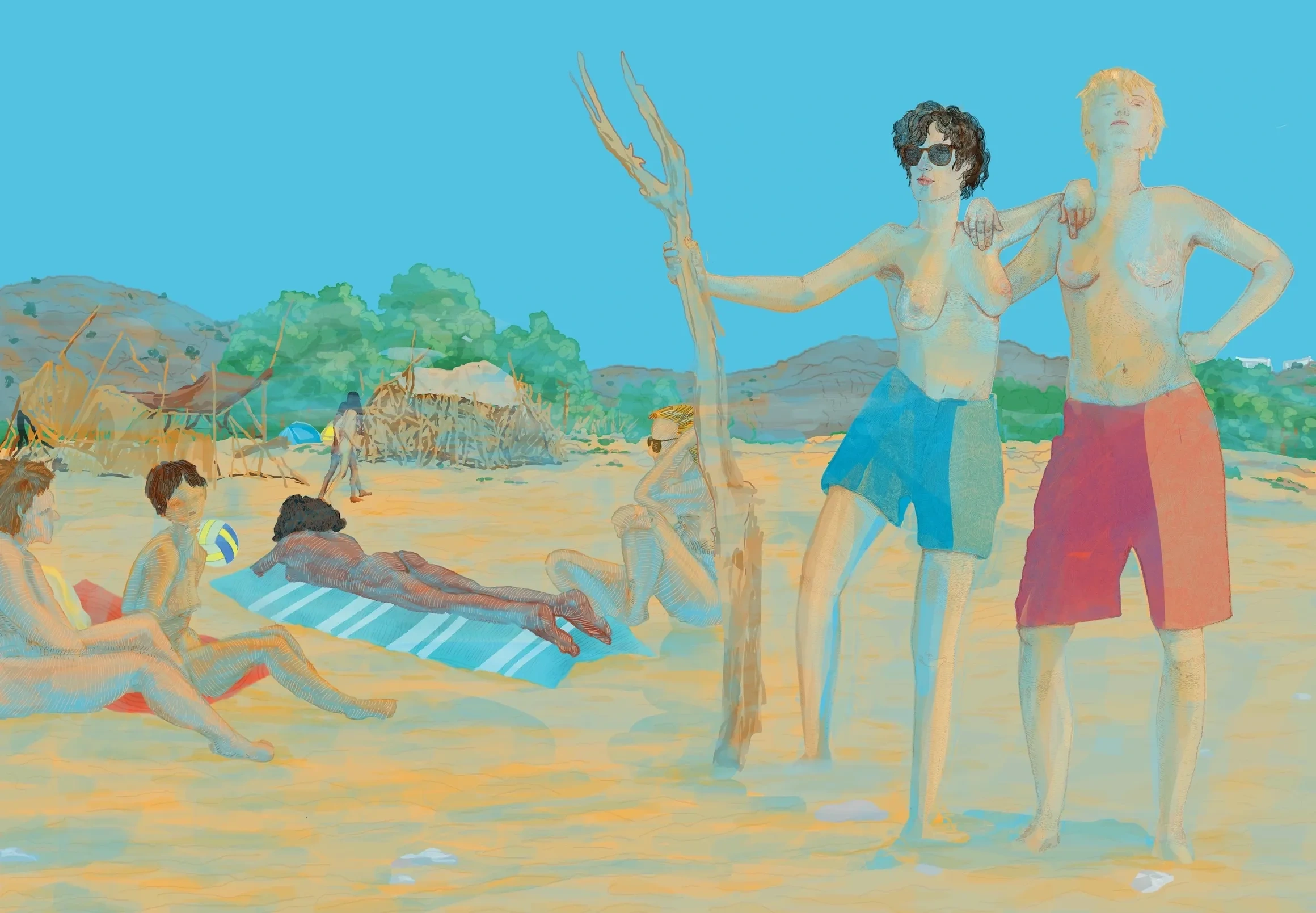 Și apoi mai sunt și alte lucruri. De exemplu, aveam 18 ani când am mers prima dată la plaja nudistă. Câte vulve crezi că văzusem la viața mea? (Râde.) Și apoi mergi pe Eresos și vezi sute de vulve, sute de feluri de sâni. Așa că, dintr-o dată, nu mai ești doar tu. Nu mai este doar aspectul corpului tău, dacă ai burtă, dacă sânii tăi sunt mici sau mari, sau nu știu ce — ești înconjurată de toate aceste femei goale. Și aceasta este o experiență eliberatoare. Același lucru se întâmplă și cu femeile care vin la plaja nudistă cu noi, dar care sunt hetero. Îmi spun același lucru. Simt aceeași libertate. Sunt eliberate de critici, din clipa în care își scot hainele. Și apoi în momentul în care o fac, totul se schimbă. Nu îți mai este rușine de tine. Nu îți mai este rușine de corpul tău. Nu îți mai este rușine de ceea ce ești.