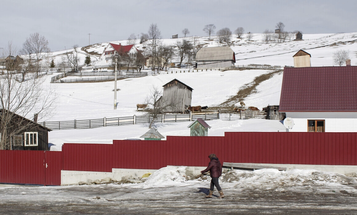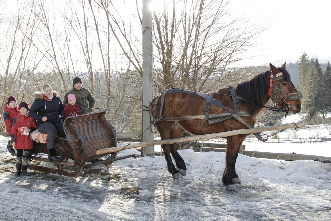Ieșim din magazin și mai dăm o tură prin sat. Ne oprim la o casă cu etaj, unde locuiesc Viorica și Vasile, un cuplu de tineri ucraineni huțuli, împreună cu cei trei copii ai lor, care în clipa asta se dau cu sania în curtea din spate. Au lucrat amândoi în Germania, lângă Mainz, timp de opt ani, dar au decis să se întoarcă în România.