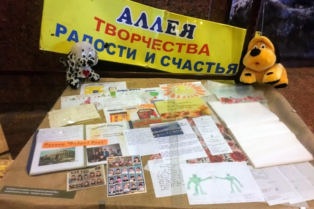 La subsolul muzeului are loc vernisajul unei expoziții temporare care sondează același subiect. Artistul grafic Serhii Zaharov a trăit și a desenat conflictul din Donbas. Pe pereții sălii se înșiră desene și picturi din seria Shells (care înseamnă și „cochilii”, dar și „cartușe de gloanțe”). Uscățiv și mai degrabă timid, artistul în vârstă de 40 de ani supranumit „Banksy din Donbas” îmi oferă cartea lui de benzi desenate, DumPster („tomberon” în engleză, aluzie titlul Republicii Populare Donetsk).
