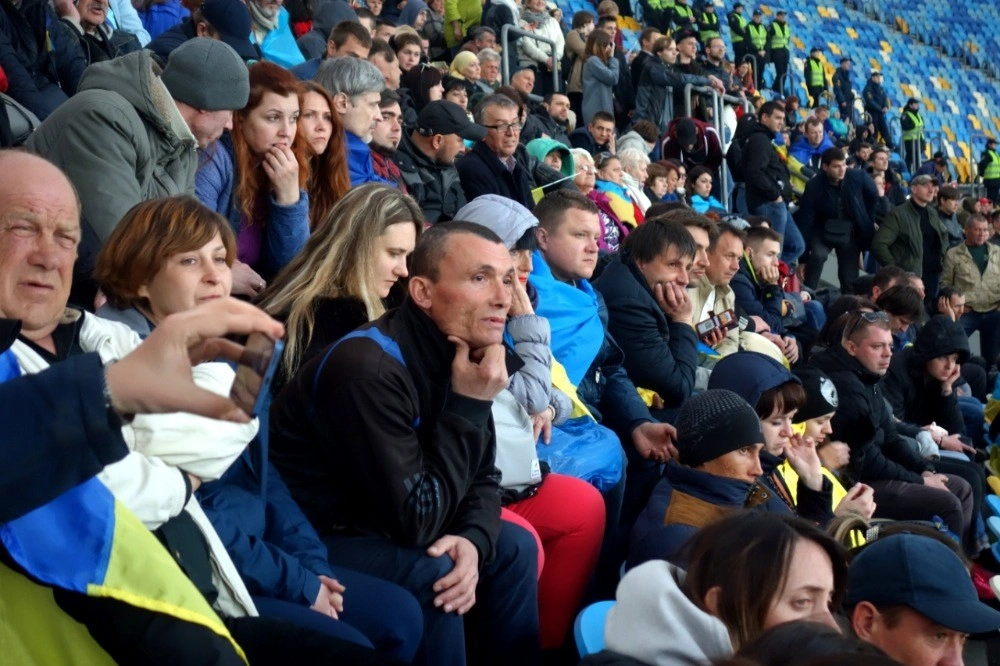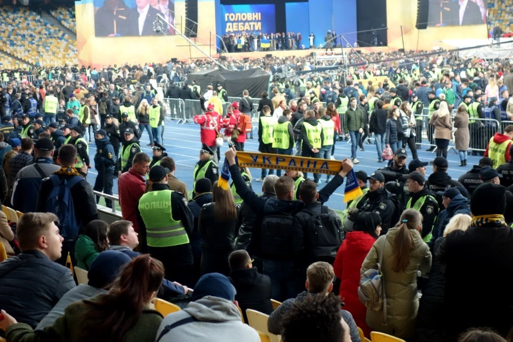 Străzile din jurul arenei olimpice de la Kiev sunt blocate pentru mașini și pline de jandarmi. Se scurg pe lângă mine grupuri de spectatori ai dezbaterii, care discută aprins pronosticurile votului - Zelenski e de departe favorit. Trec prin trei filtre de pază, intru pe stadion și văd o mare bleu-galbenă, culorile naționale ale Ucrainei. Pe gazon se dă lupta. Cele două grupări de susținători ai candidaților sunt despărțite de un gard metalic și un rând de jandarmi.