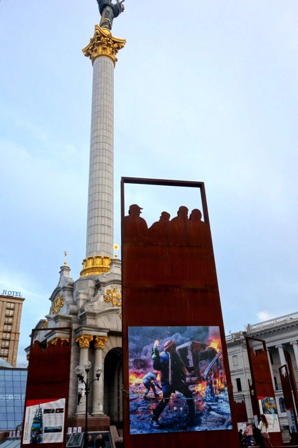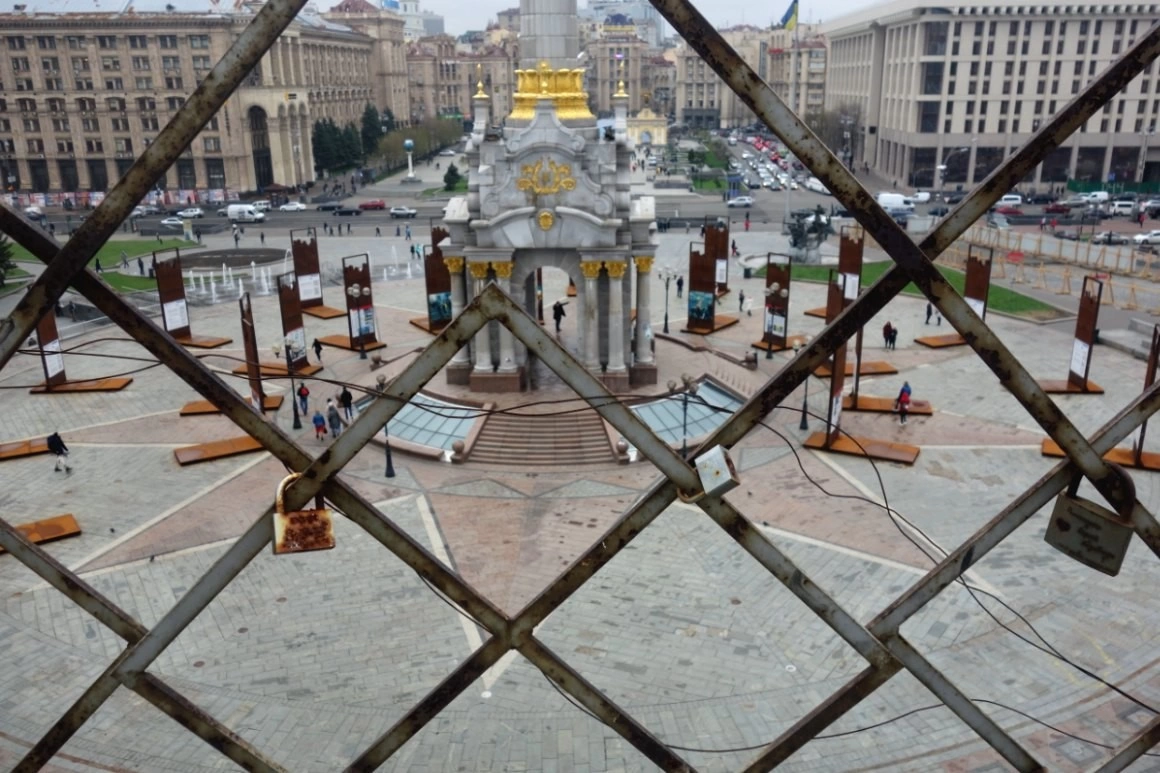 În Piața Independenței au rămas vestigiile revoluției sângeroase, care a pornit din alegerea Ucrainei de a privi spre Europa. Nu se știe nici azi cu siguranță câți oameni au murit atunci - unele estimări merg până la 130 de decese, dintre care 18 din rândul forțelor de ordine. Pe strada paralelă cu Maidanul, Institutska, și în Piața Kreșceatik, alăturată, rămân micile altare ale Maidanului. Bucăți de baricade de-atunci, din cauciucuri și fiare. Grămezi de pietre de pavaj, alături de portretele celor uciși. Gaura în pământ, unde era clădirea incendiată, se pare, de către controversata poliție militară Berkut, desființată în urma Maidanului. Lumânări, rugăciuni pentru Ucraina.