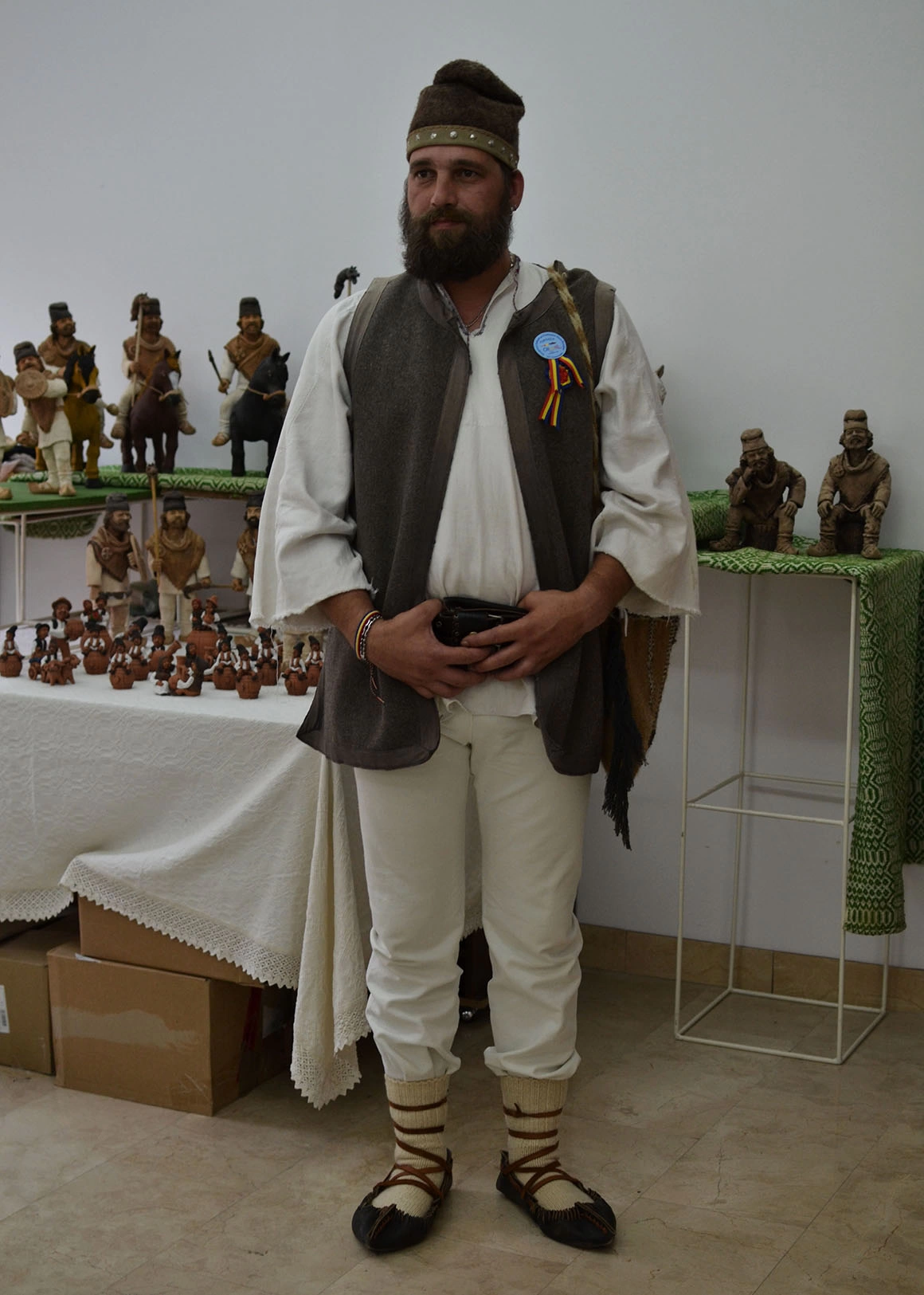 În holul Consiliului Județean Buzău, dăm de un român autentic, înalt, cu barbă, și îmbrăcat în port dacic, care ne povestește cu mândrie despre veșmintele sale. „Șosetele-s făcute de soție, chimiru’ l-am moștenit de la tatăl meu”, zice Marius Diaconu. „Cămășoaia, am făcut un schimb cu o doamnă de la Maramureș. Căciula, asta este munca unei prietene foarte bune din Republica Moldova”.