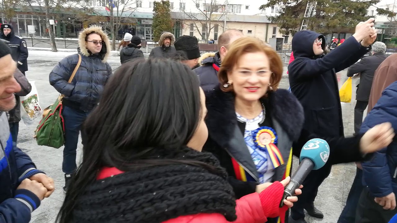 Într-un alt capăt al pieței, un localnic se-oprește la chioșc și cere un vin fiert. Atunci când vânzătorul îi zice că azi nu e voie, localnicul scapă o ditamai înjurătura și pleacă mai departe. La câțiva pași mai încolo, europarlamentarul Maria Grapini încearcă o mică baie de mulțime, însoțită de o echipă de la Antena3. Lasă cetățenii să-i pupe mâna, spune oricui o întreabă că aseară s-a întors de la Bruxelles, unde a luptat pentru România și că trebuie să fim „buni români și uniți”. Se oprește din discuție atunci când niște domni în uniforme vin să împartă ediții speciale din România Liberă cu titlul „Focșani, primul oraș european” și exclamă: „Parcă ne-am întoars în trecut!”.