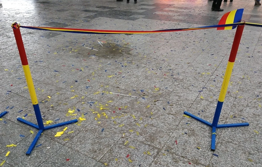 Câțiva maratoniști aleargă cu steaguri de toate felurile: al României, Uniunii Europene, unul pe care e desenat un lup dacic și un altul cu chipul lui Eminescu; o japoneză stabilită de 12 ani în România poartă un drapel ce reproduce unul de luptă din vremea lui Ștefan cel Mare, după cum ne spune cu mândrie. Primarul Cristi Misăilă iese și se pozează cu ei, apoi se întoarce repejor în sediul Consiliului Județean. Un colț al pieței, în dreapta tribunei oficiale, e ocupat deja de elevi cu pancarte pe care sunt scrise numele școlilor și liceelor pe care le reprezintă. Stau lipiți unul de celălalt, ca o colonie de pinguini. Îi întrebăm de ce-au venit cu o oră înaintea evenimentului, iar un băiat ne explică sumar că „așa ni s-a spus”.