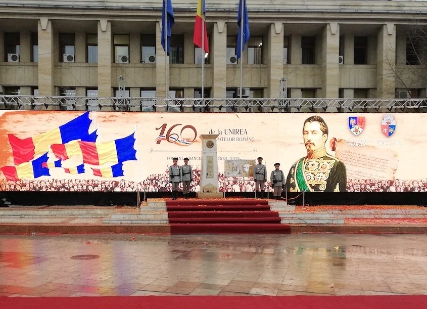 Cu vreo oră înainte să înceapă programul artistic, câțiva oameni se învârt înfrigurați prin Piața Unirii. Dreptunghiul pieței e dominat de obeliscul dedicat Unirii, aflat în lucrări de reabilitare din aprilie 2017 și îmbrăcat încă într-o mușama zdrențuită. Centrul evenimentului e însă mai încolo, în dreptul sediului Consiliului Județean: e amplasată acolo o tribună, iar în spatele ei e un ecran lung, cu o scenă din timpul săvârșirii Unirii. Alături sunt amenajate două scene: pe una dintre ele vor urca tinerii care vor intepreta imnul național alături de Paula Seling și Gheorghe Zamfir, iar pe cealaltă, plasată înspre bulevard, aleșii vor urmări parada militară. Această zonă pregătită pentru invitați e separată cu garduri și cu stâlpișori tricolori de cetățenii de rând, iar jandarmii sunt împrăștiați peste tot. Detașamente de angajați ai serviciului local de curățenie sparg gheața de pe trotuare și-i ocolesc cu grijă pe cetățenii care se opresc pentru a admira caii pregătiți pentru defilare, lângă clădirea ansamblului folcloric Țara Vrancei.