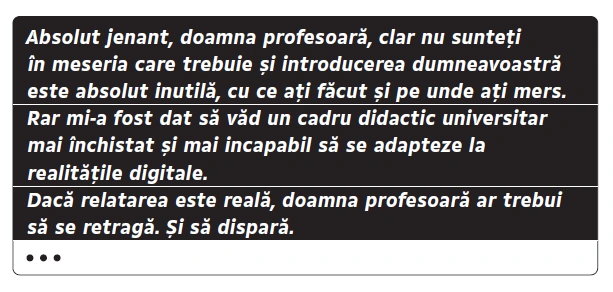 În mai, anul acesta, Gabriela Niculescu (51 de ani), profesoară la Universitatea Politehnica din București, a devenit protagonistă în „viralul zilei”, cum l-a numit presa. Pe când vorbea la un curs online despre posibile metode de verificare în timpul unui examen la distanță, în pandemie, unul dintre studenții ei a filmat-o pe ascuns. A prins și momentul în care profesoara i-a spus unui student să-și agațe telefonul de gât, să se asigure că nu copiază. „Am făcut o glumă,” îmi spune profesoara la telefon. „El a luat-o în serios.”
