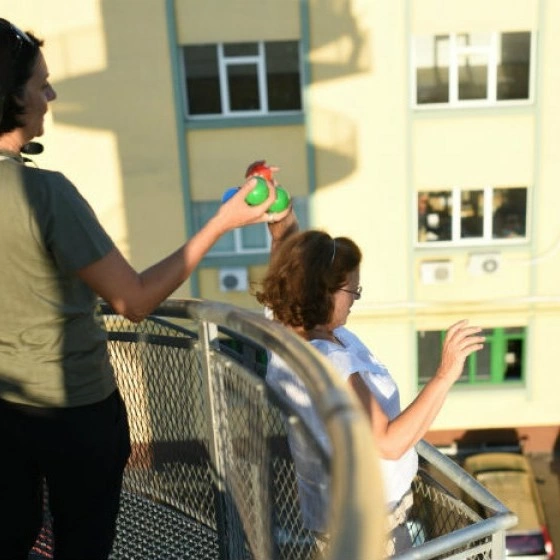 Când m-am dus să mă întâlnesc cu Biancoshock, am bătut Bucureștiul de la un capăt la altul, din Militari până-n Pantelimon, unul dintre cartierele-dormitor capitalei, care au multe lucruri în comun, cum ar fi o lipsă aproape totală de viață culturală. Am ieșit de la metrou în hărmălaia de centre comerciale și tarabe cu unelte de pescuit, în intersecția îmbăiată în miros de viermuși și momeli aromate. Am ajuns la Turnul de Apă de la fosta Postăvărie Română, pe care Make a Point l-a deschis în 2013 pentru oricine vrea să vadă orașul de la înălțime, și l-am găsit pe Biancoshock obosit, după ce timp de câteva ore umpluse 300 de găleți cu apă. Fiindcă găleata e materialul din care și-a scris lucrarea: un „NU POT” mare cât un acoperiș al fostei fabrici de textile. Mesajul lui, pe care poți să-l vezi dacă urci pe scara Turnului de Apă, rezumă felul în care a înțeles și procesat istoria cartierului Pantelimon, după ce-a citit poveștile adunate de Make a Point de la locuitori și-a citit despre București și trecutul lui comunist. „NU POT”-ul ăsta din găleți cu apă, spune el, e senzația de neputință a oamenilor captivi într-un stat totalitar, pe care-o deturnează invitând publicul să se joace. Să arunce, de la distanță, mingi colorate în gălețile cu apă și, printr-un gest copilăresc, să chestioneze neputința asta.