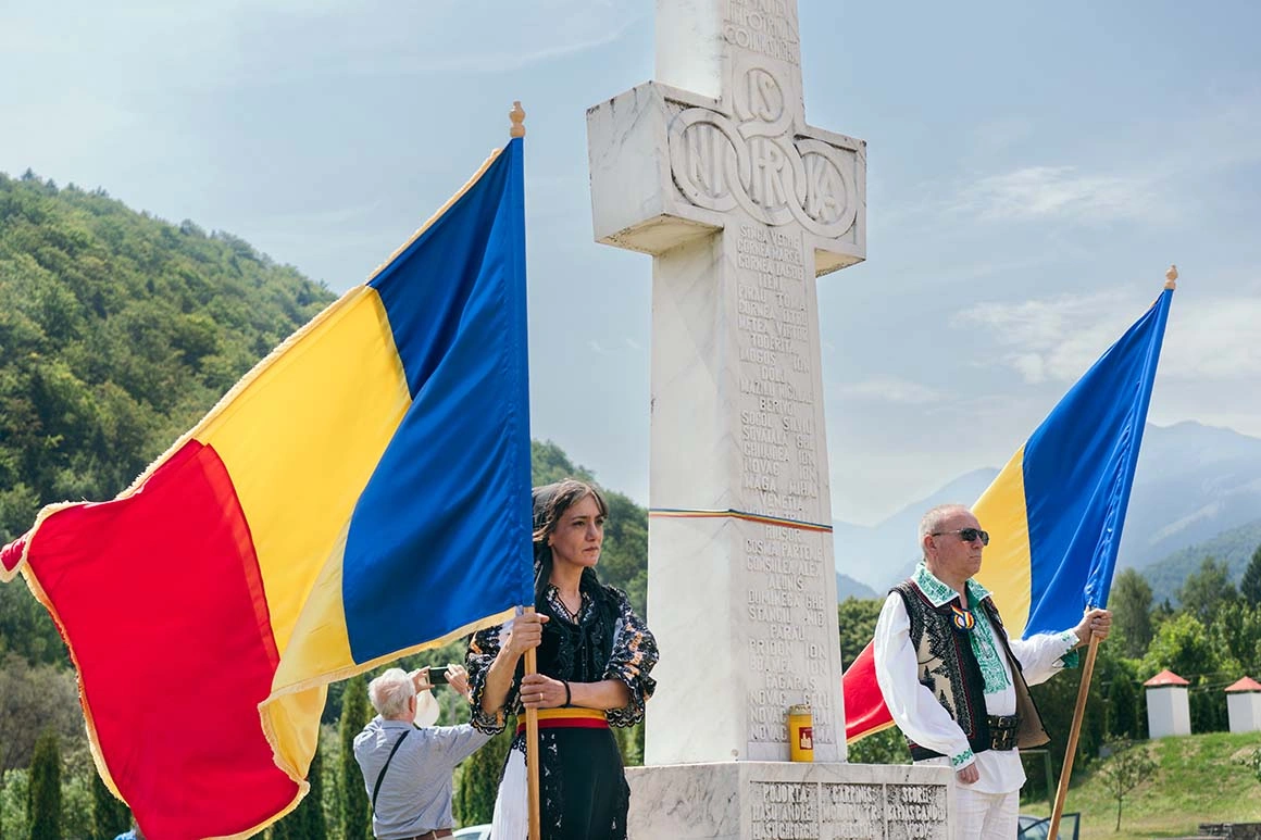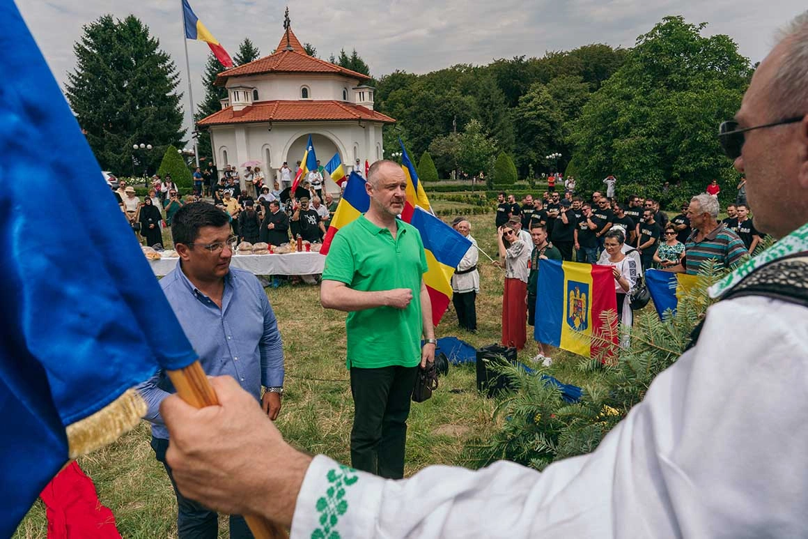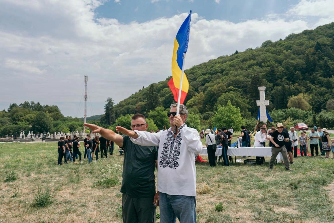 Pe la 10, însă, mai mulți bărbați îmbrăcați în negru încep să mărșăluiască pe potecile mănăstirii, agitând tricolorul. Nu pare să le stea nimic în cale, nici măcar arșița care a trecut de munții Făgăraș încă de la primele ore ale dimineții. Se opresc în fața unei cruci, unde alți bărbați voinici întind o masă cu pâine împletită, vin și candele roșii. Întind tricolorul pe iarbă și în brațele oamenilor așezați pe două coloane: de-a stânga crucii stau cei în costum popular, de-a dreapta cei ce poartă ochelari de soare fumurii și tricouri negre. Pe ele scrie ULTRAS, alături de logo-ul „Uniți sub tricolor”, o grupare de suporteri ai fotbalului fondată de liderul partidului extremist AUR, George Simion, implicată deseori în scandaluri și violențe pe stadioane. Pe câteva dintre steagurile lor flutură chipurile legionarilor Ion Gavrilă Ogoranu și Valeriu Gafencu, foști membri ai grupurilor de tineret din Mișcarea Legionară.